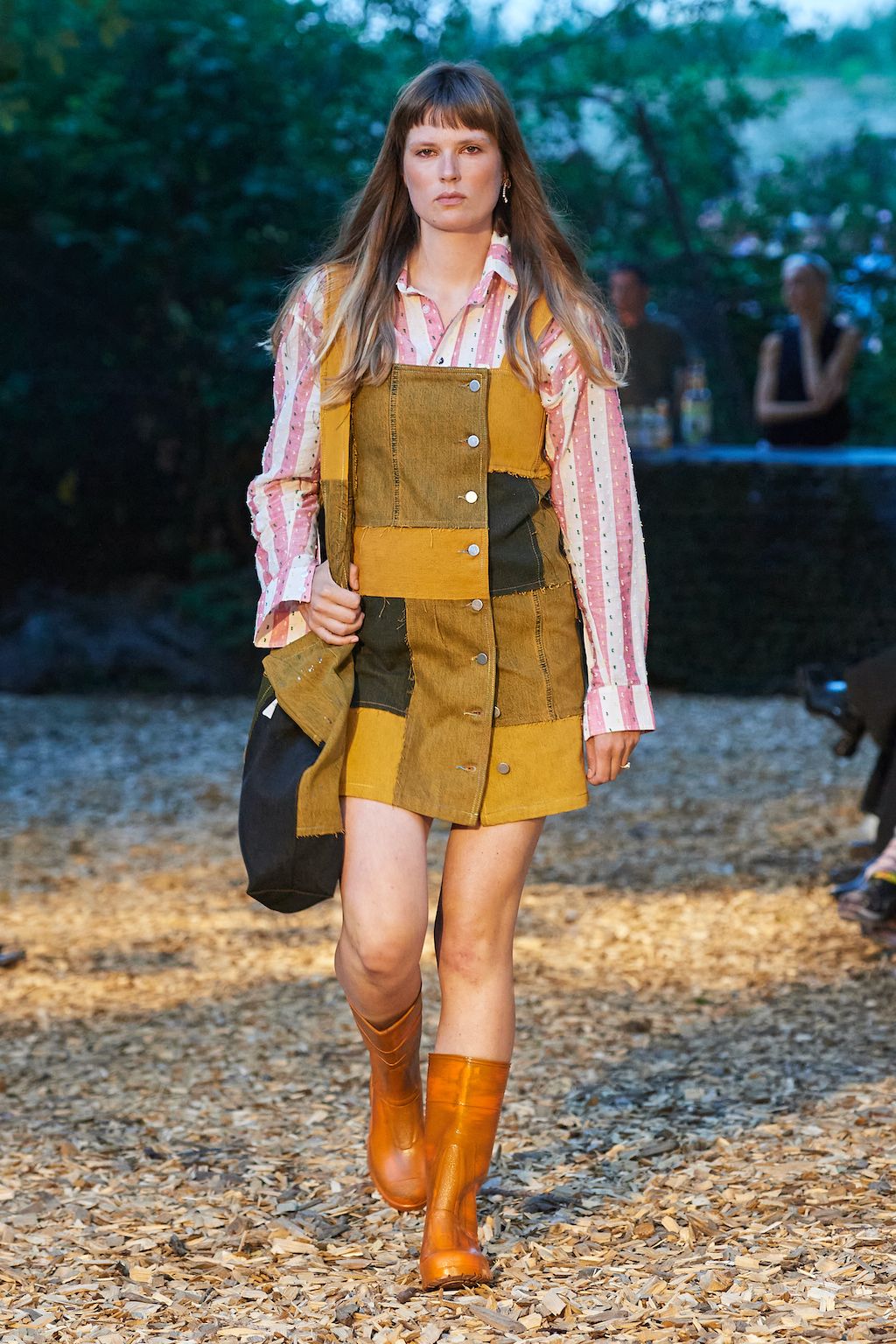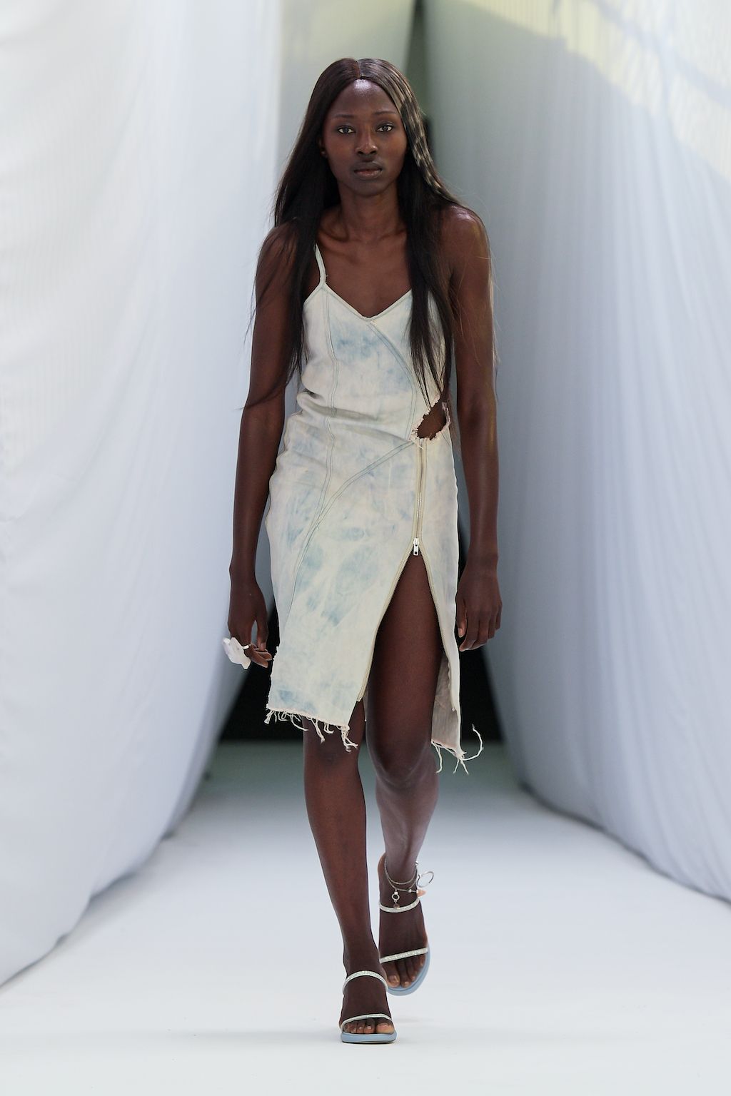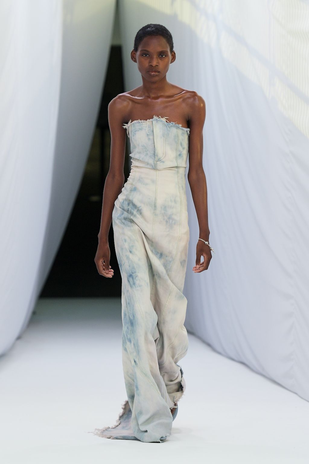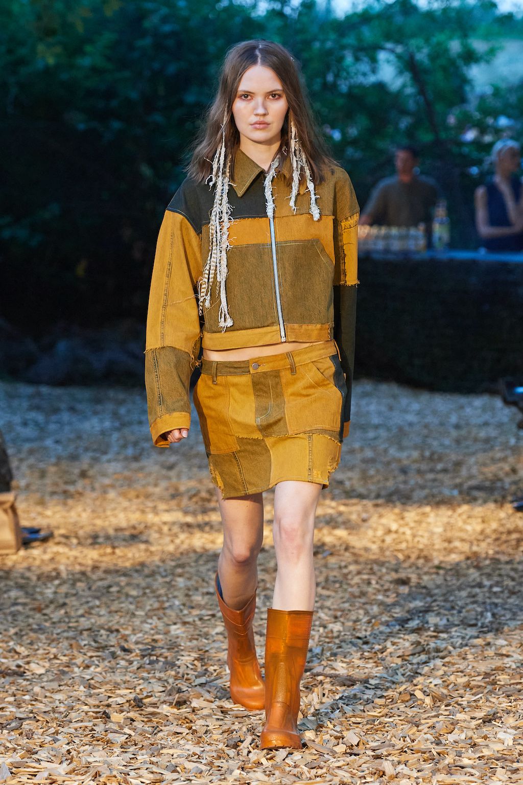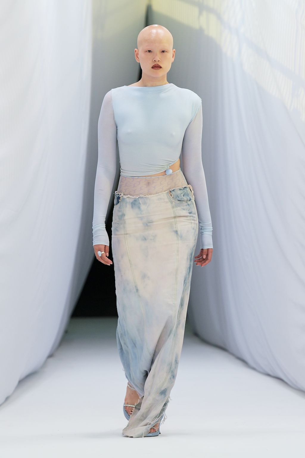 In addition, other leitmotifs of Expressionism can be found in her inspiration for the collection, such as an enthusiasm for decay in nature and beauty of the imperfect. The collection included bleached and hand-dyed denim pieces, monogramed and gradient fine knits, distressed knitwear and leather fastenings. All looks were presented by the models wearing heels by Dutch leather brand Wandler.