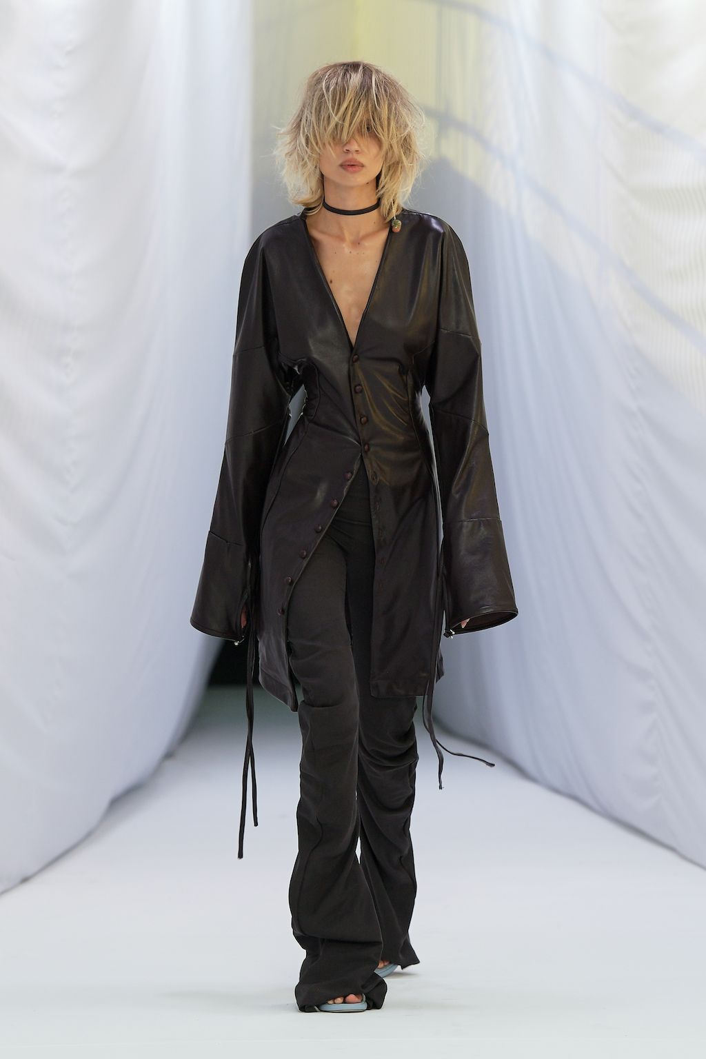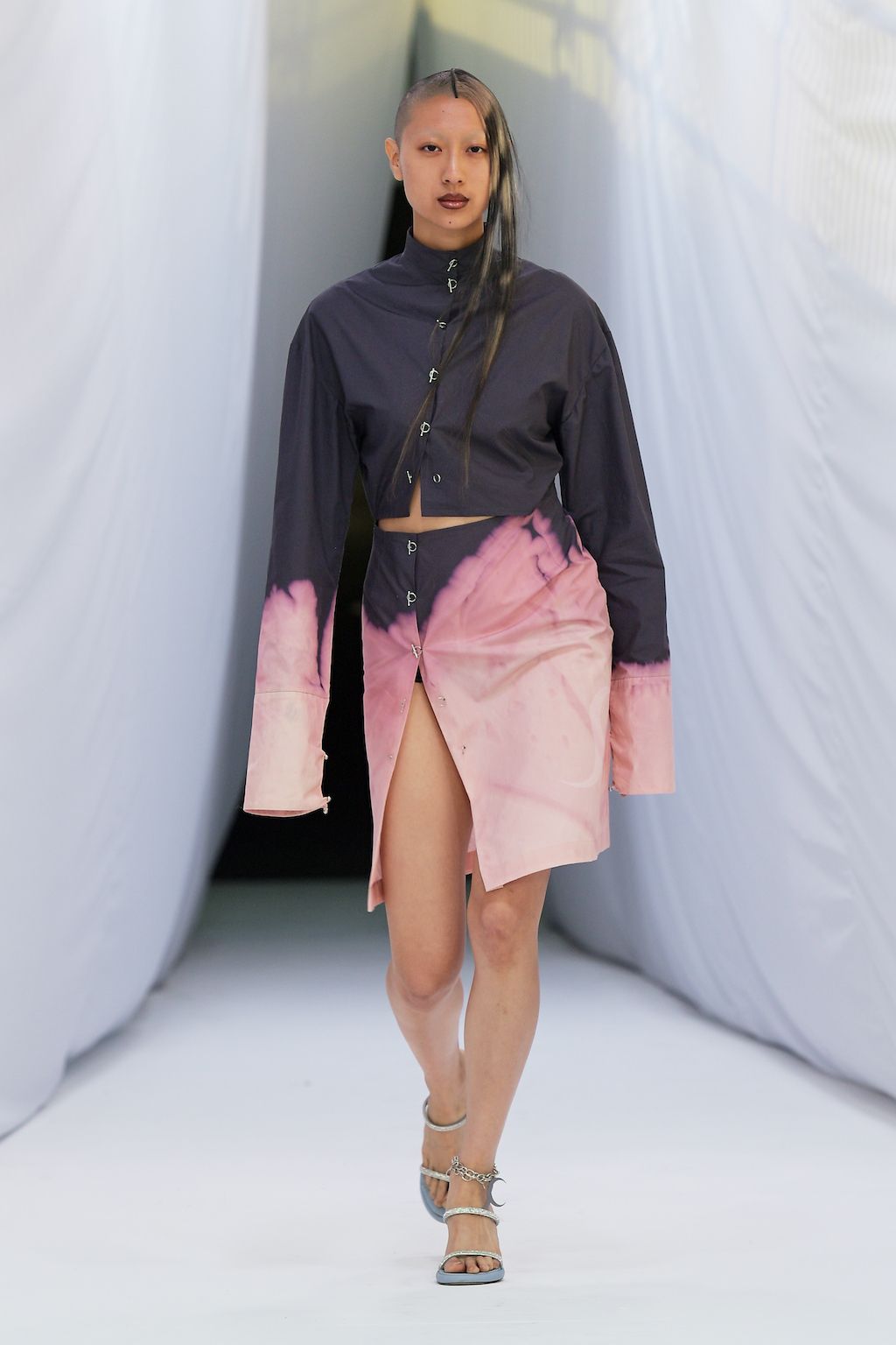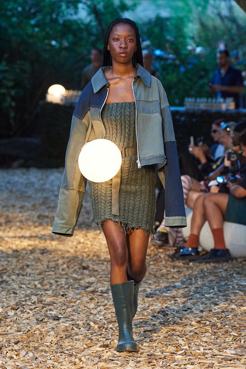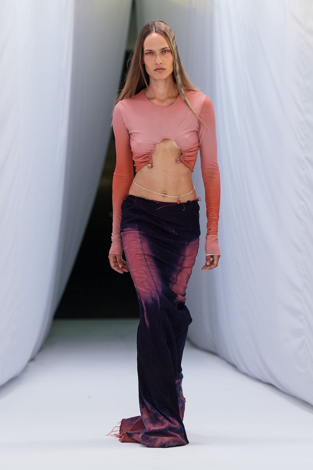 In addition, other leitmotifs of Expressionism can be found in her inspiration for the collection, such as an enthusiasm for decay in nature and beauty of the imperfect. The collection included bleached and hand-dyed denim pieces, monogramed and gradient fine knits, distressed knitwear and leather fastenings. All looks were presented by the models wearing heels by Dutch leather brand Wandler.