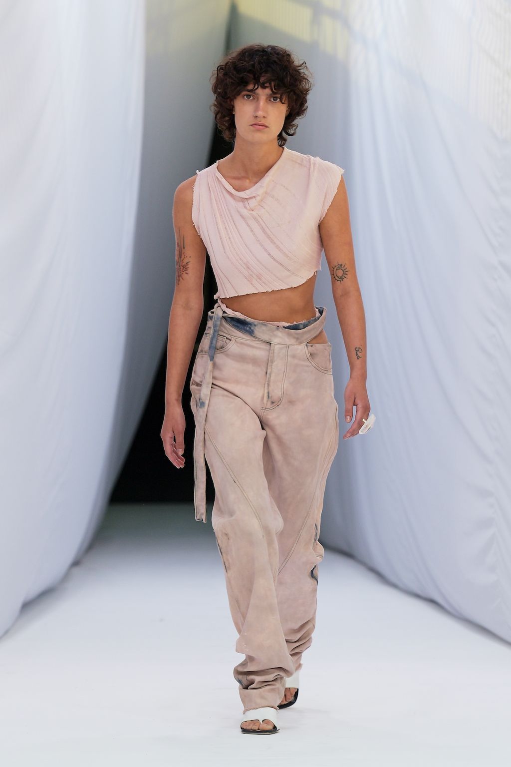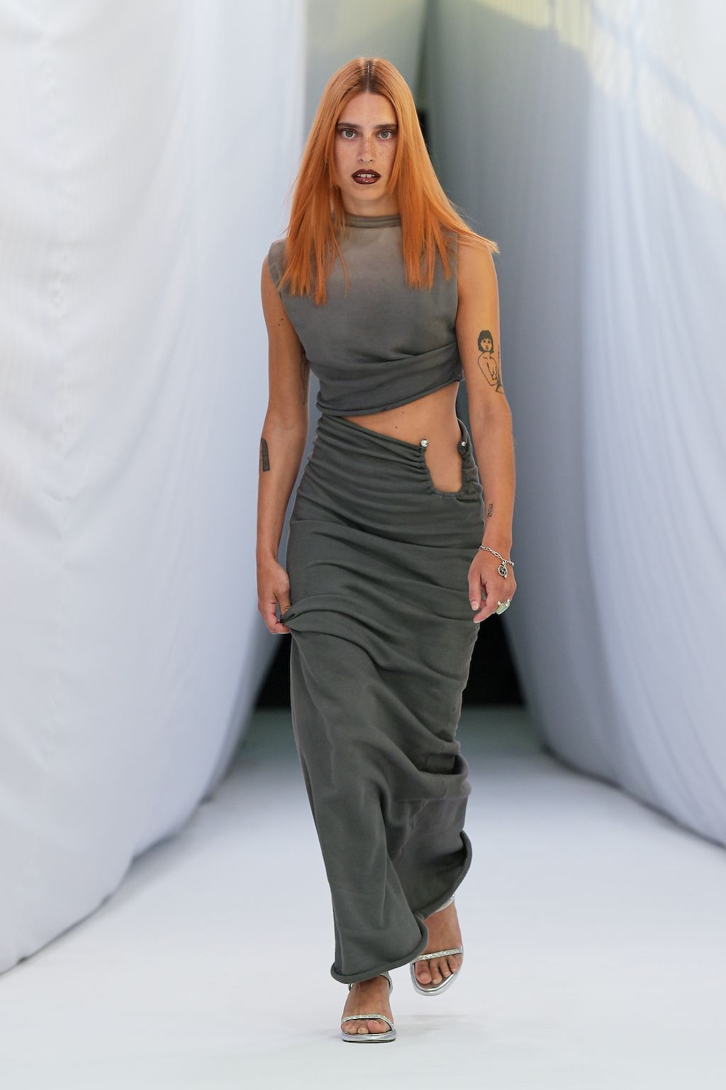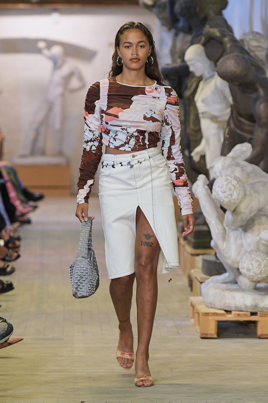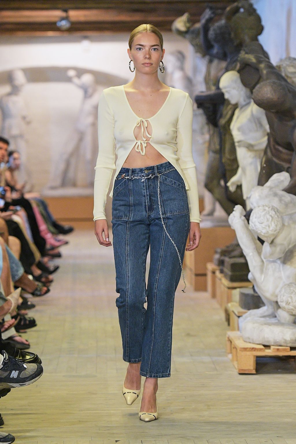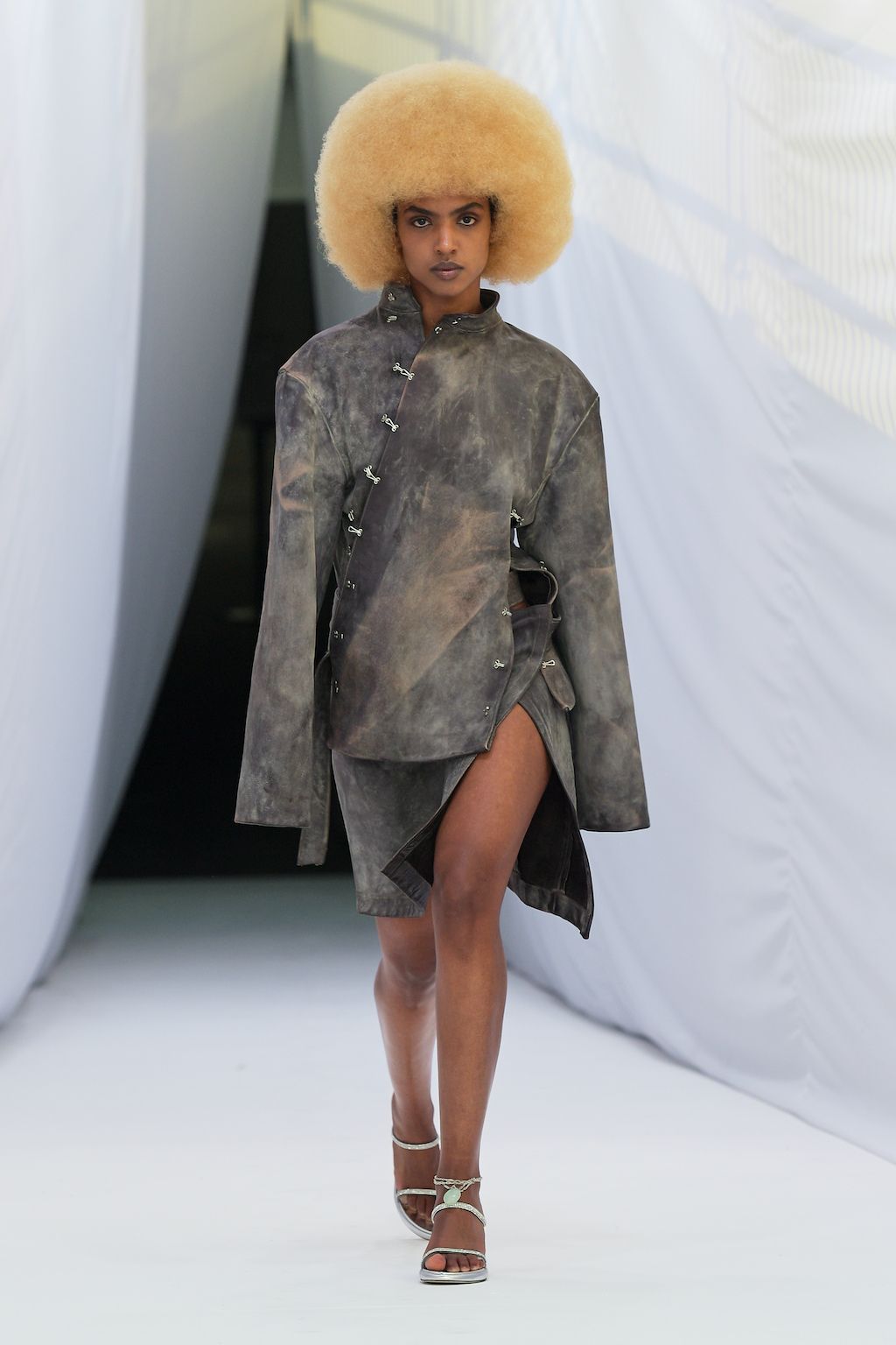 In addition, other leitmotifs of Expressionism can be found in her inspiration for the collection, such as an enthusiasm for decay in nature and beauty of the imperfect. The collection included bleached and hand-dyed denim pieces, monogramed and gradient fine knits, distressed knitwear and leather fastenings. All looks were presented by the models wearing heels by Dutch leather brand Wandler.