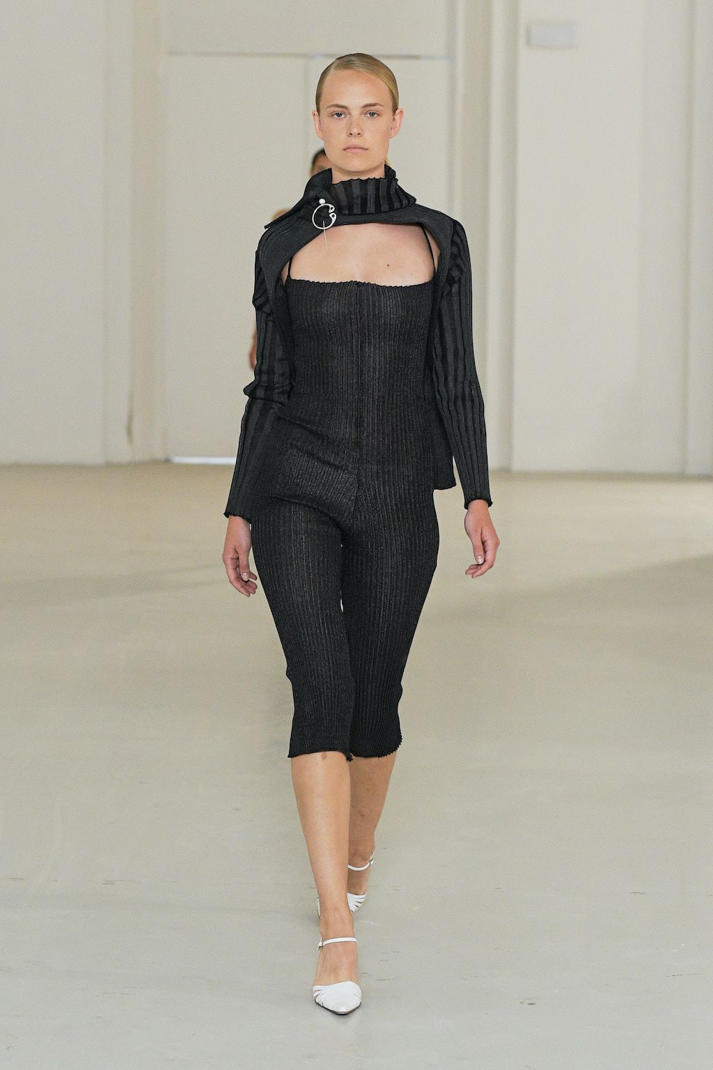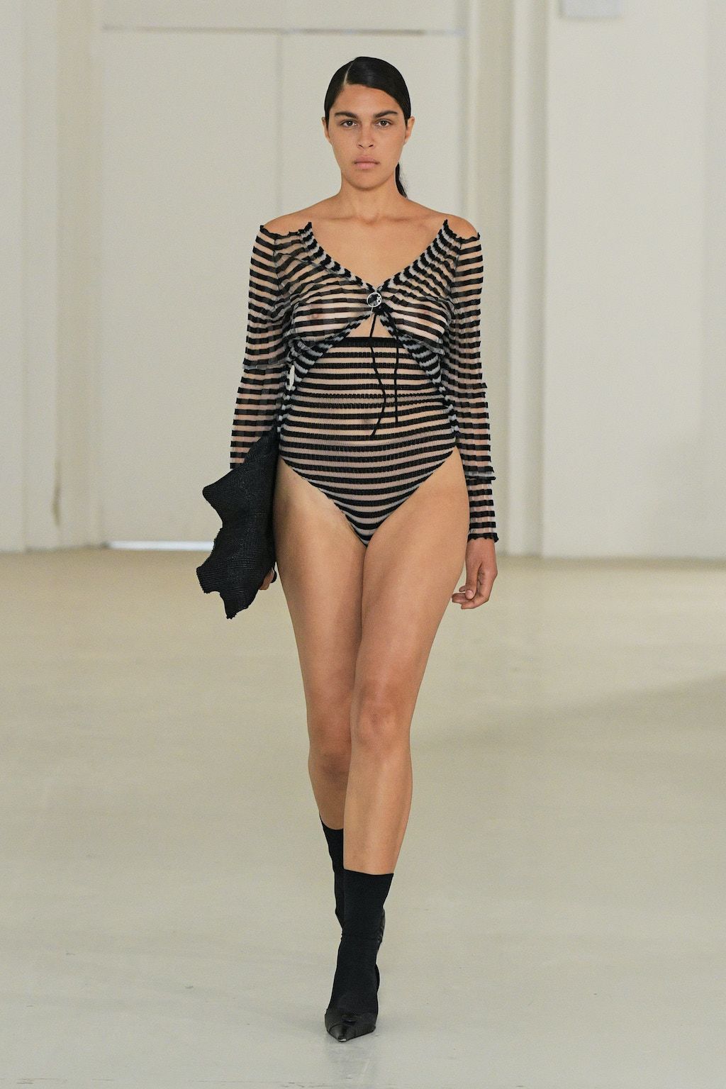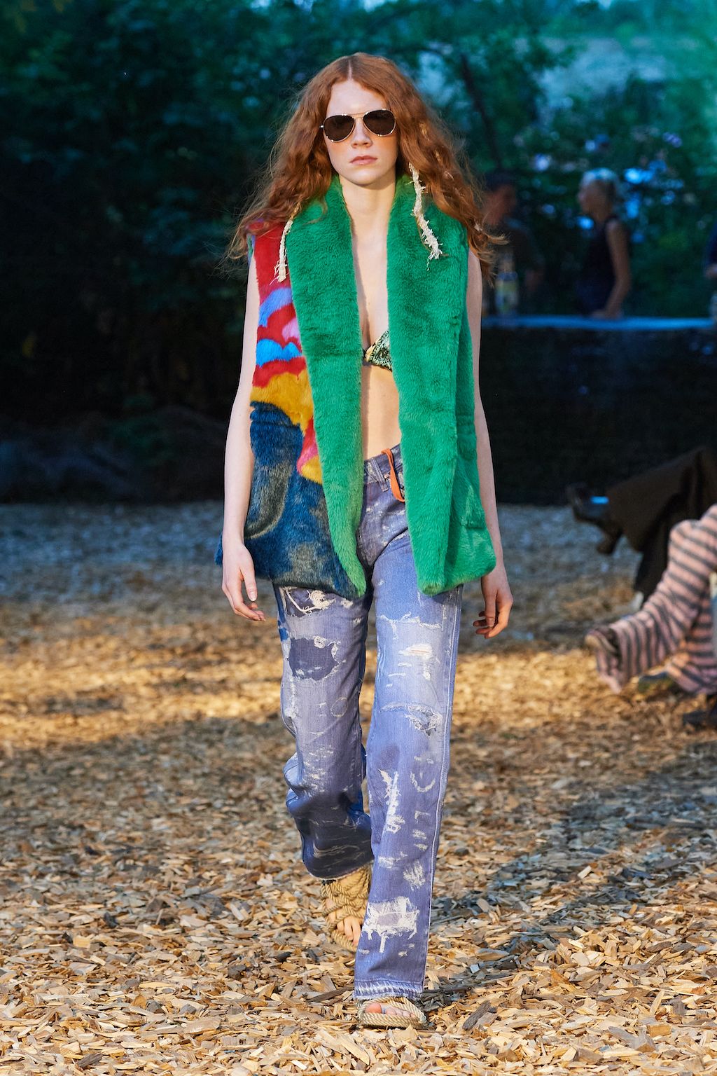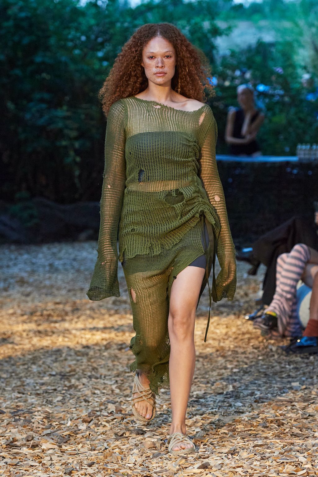 In addition, other leitmotifs of Expressionism can be found in her inspiration for the collection, such as an enthusiasm for decay in nature and beauty of the imperfect. The collection included bleached and hand-dyed denim pieces, monogramed and gradient fine knits, distressed knitwear and leather fastenings. All looks were presented by the models wearing heels by Dutch leather brand Wandler.