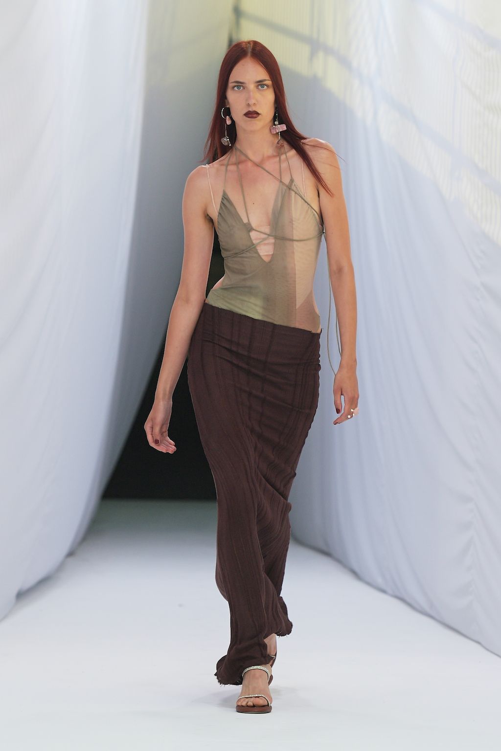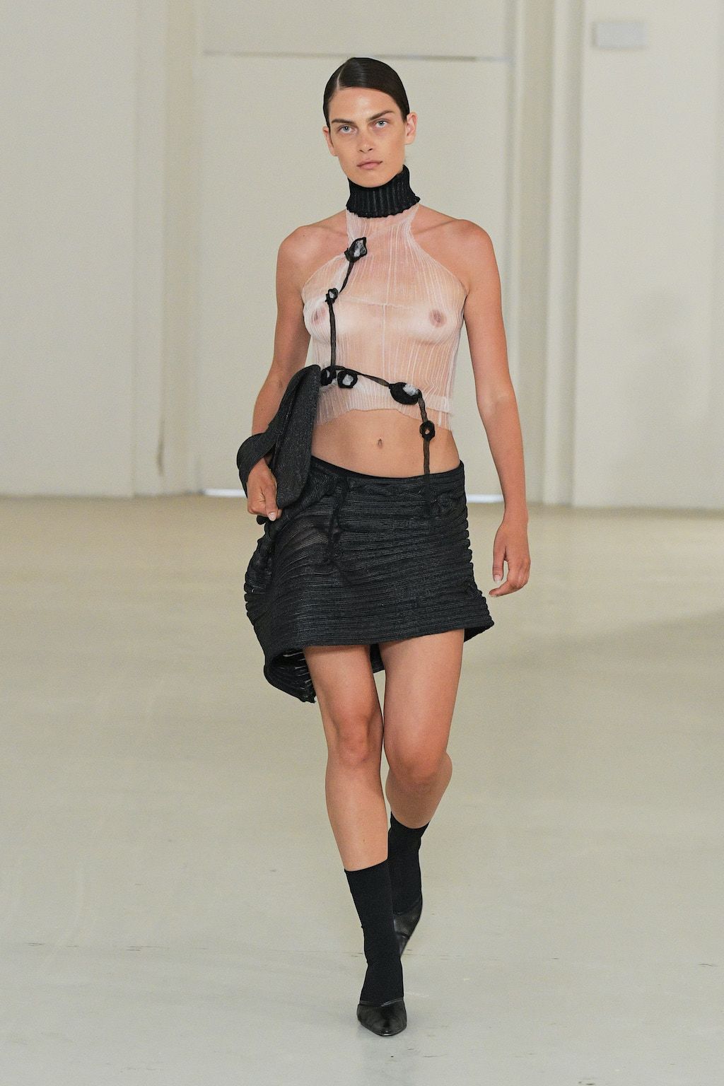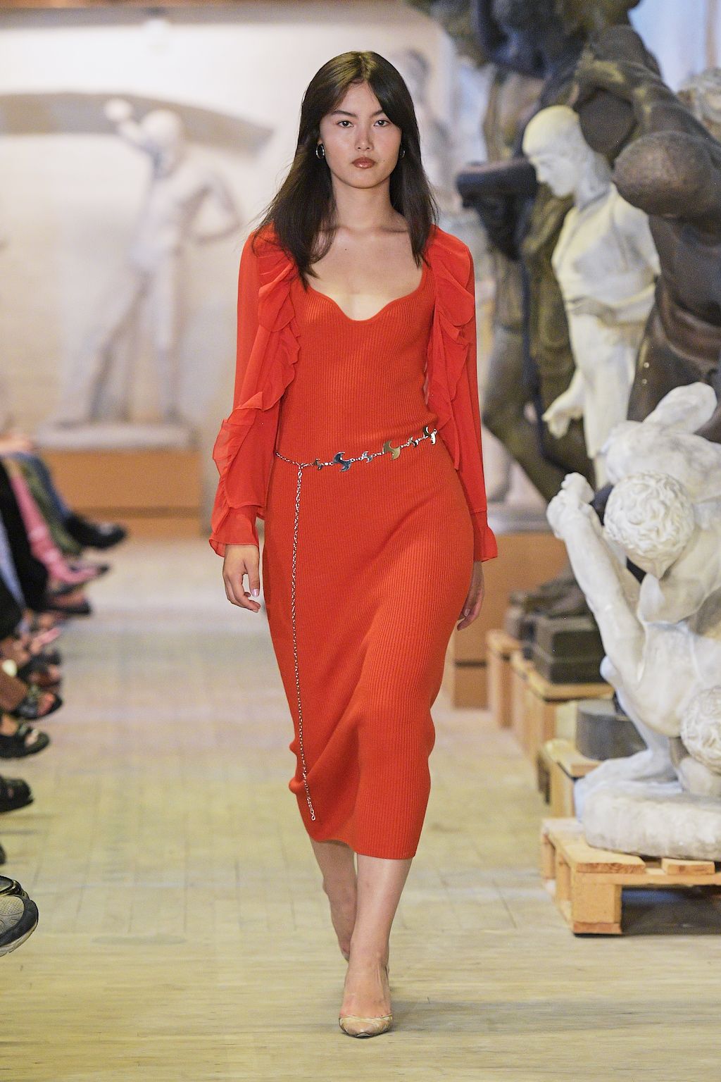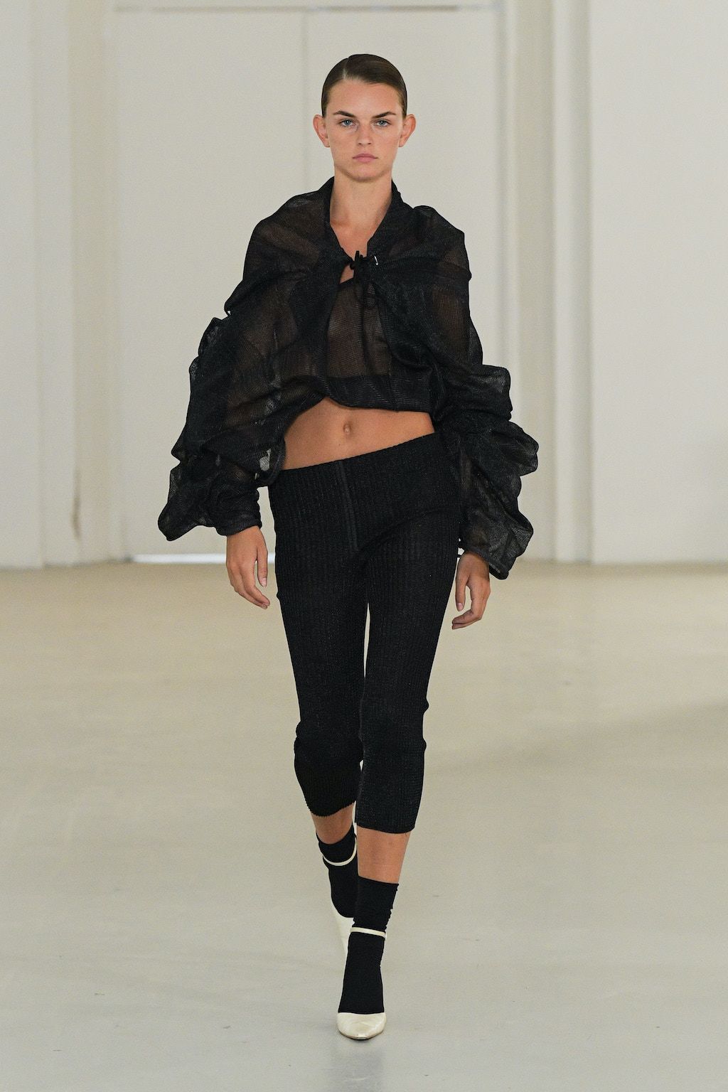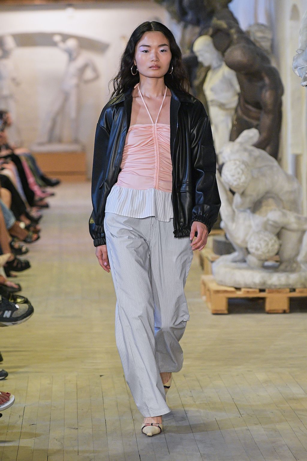 In addition, other leitmotifs of Expressionism can be found in her inspiration for the collection, such as an enthusiasm for decay in nature and beauty of the imperfect. The collection included bleached and hand-dyed denim pieces, monogramed and gradient fine knits, distressed knitwear and leather fastenings. All looks were presented by the models wearing heels by Dutch leather brand Wandler.