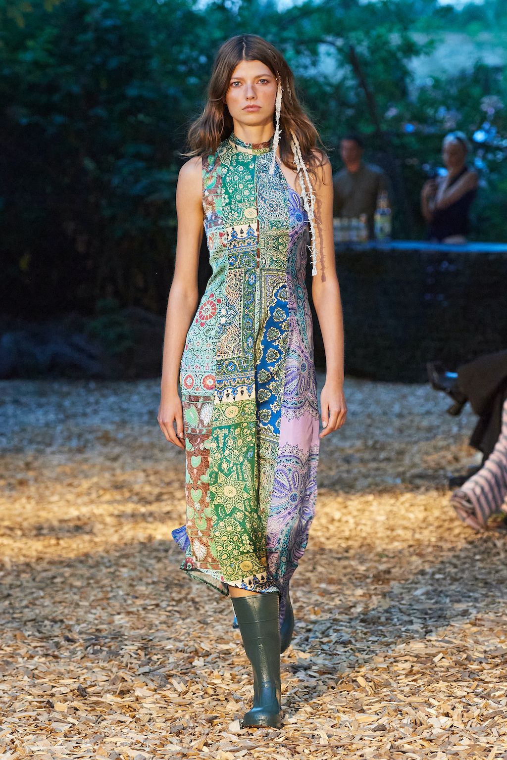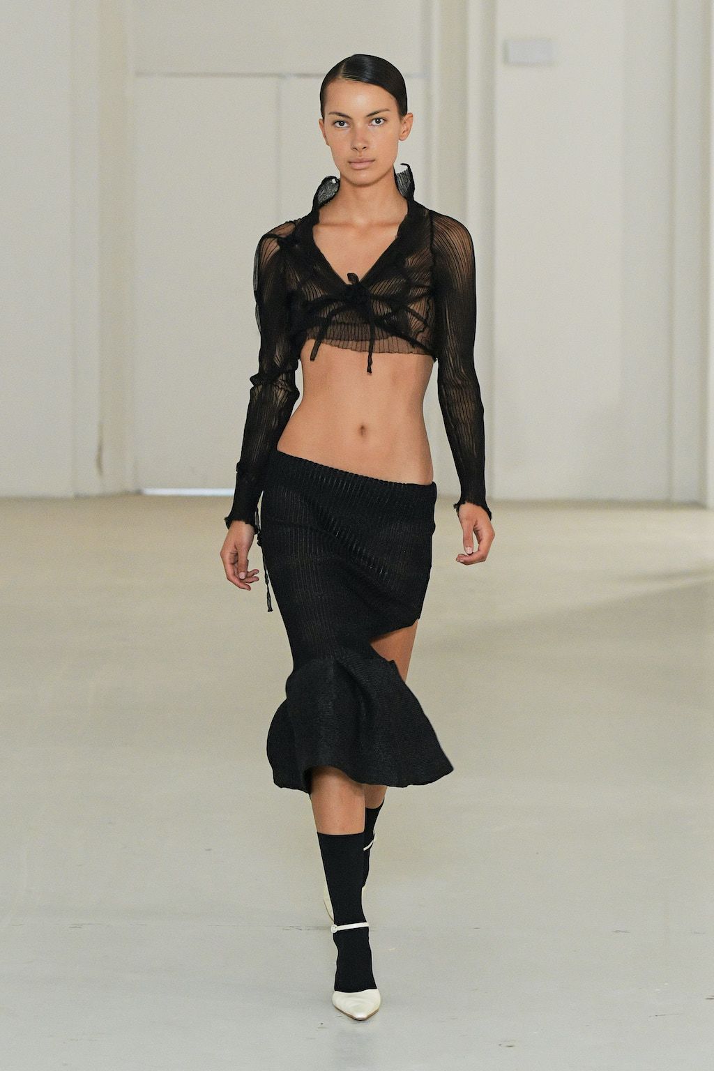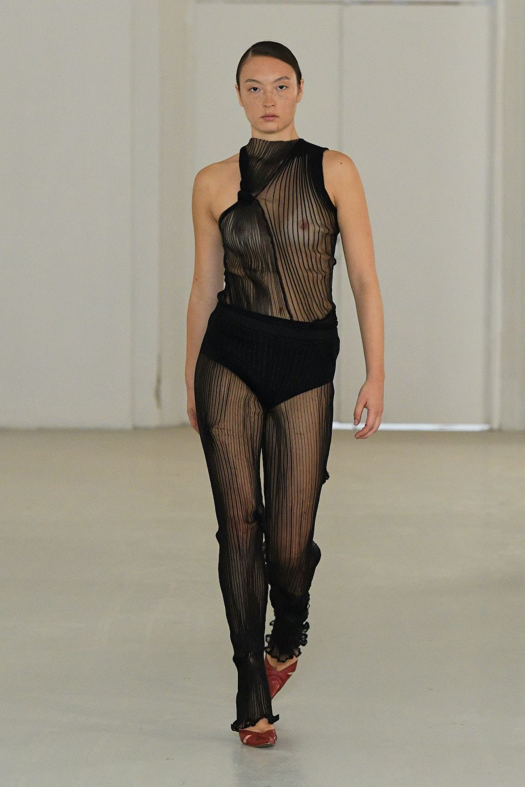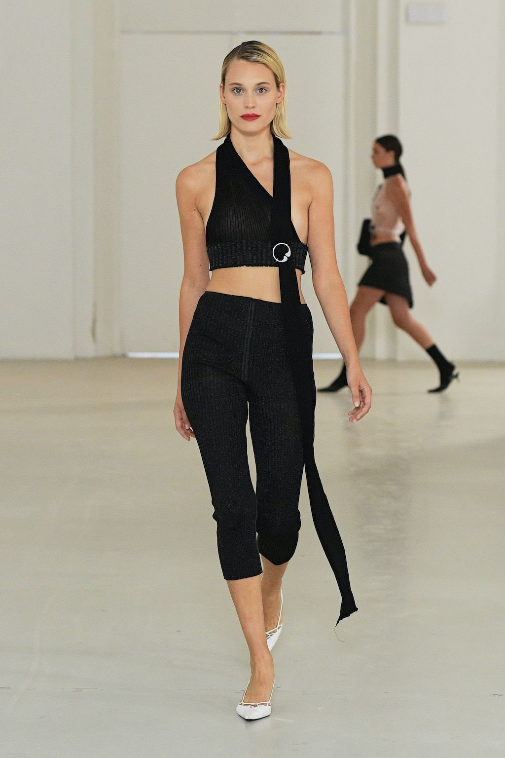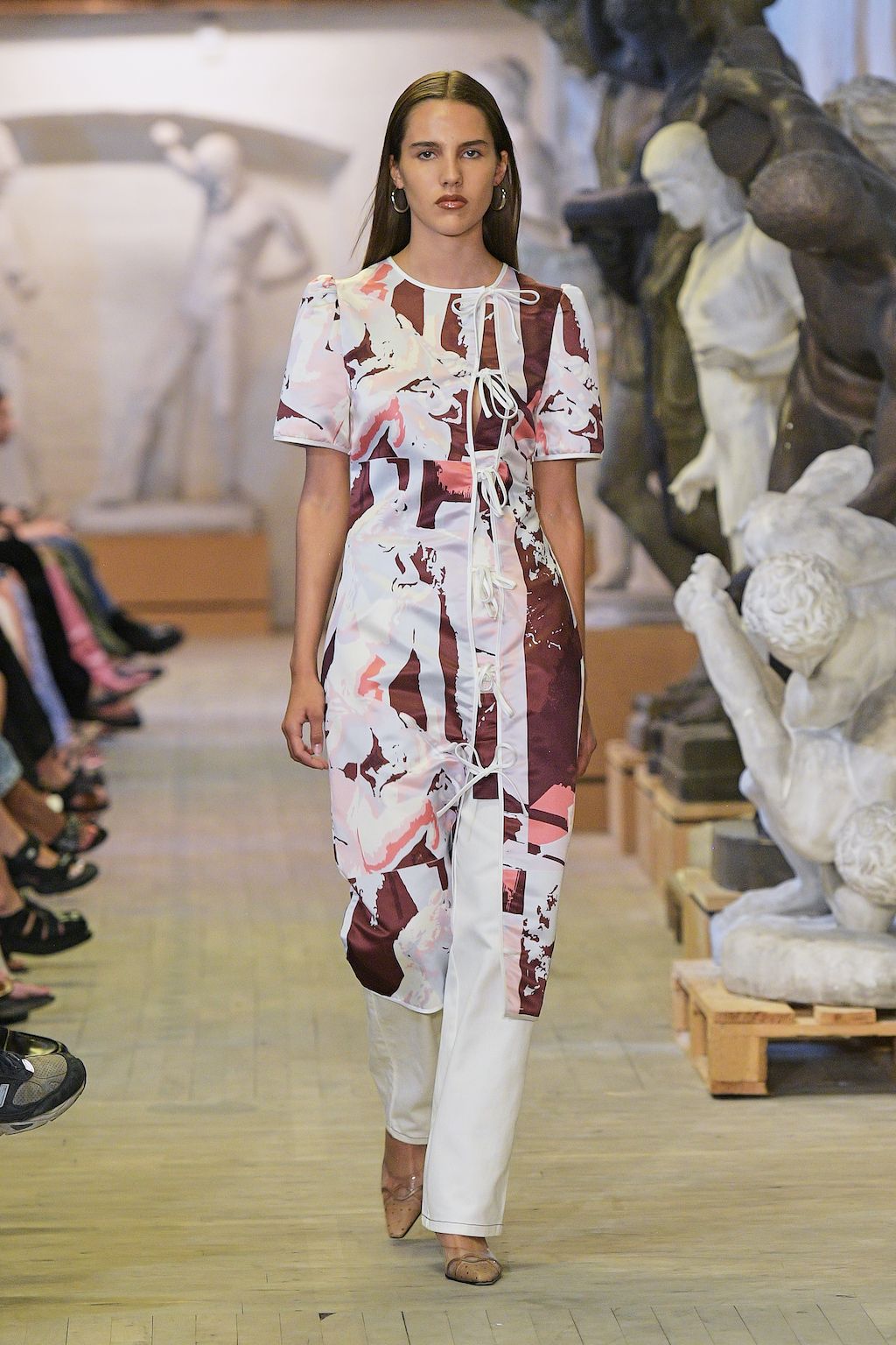 In addition, other leitmotifs of Expressionism can be found in her inspiration for the collection, such as an enthusiasm for decay in nature and beauty of the imperfect. The collection included bleached and hand-dyed denim pieces, monogramed and gradient fine knits, distressed knitwear and leather fastenings. All looks were presented by the models wearing heels by Dutch leather brand Wandler.