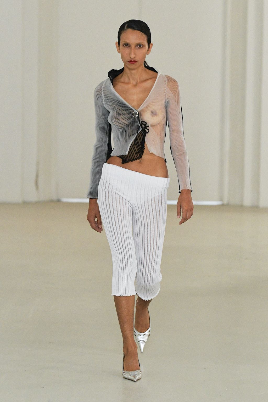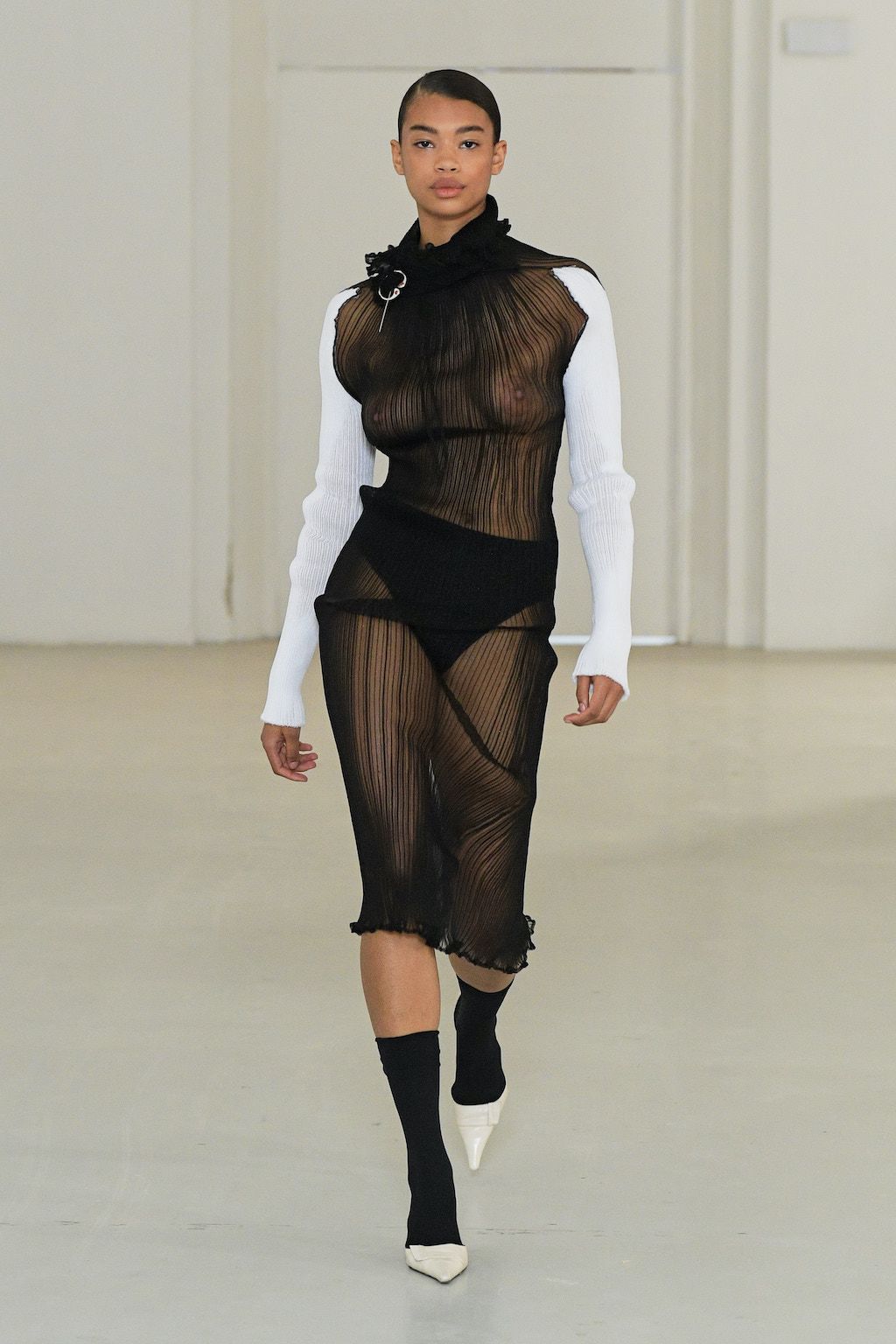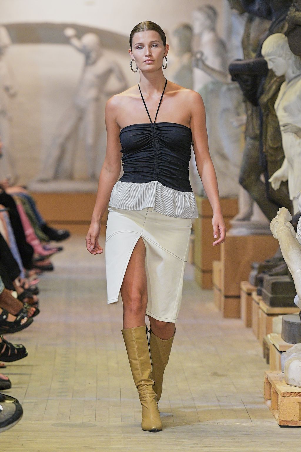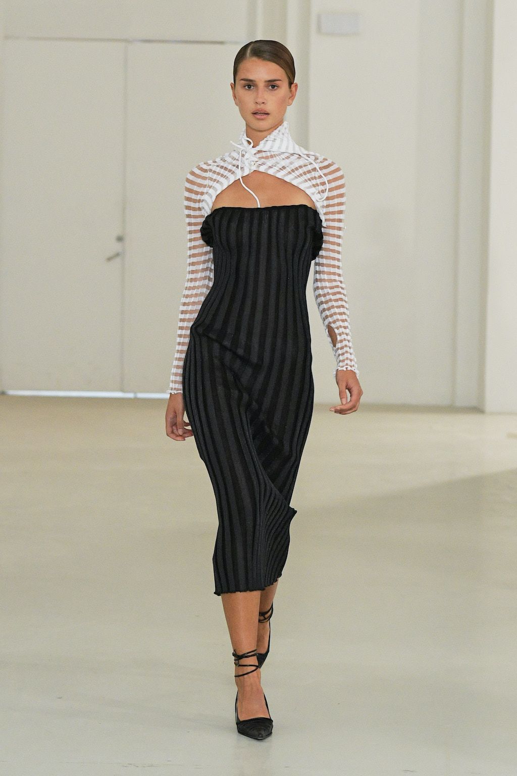 In addition, other leitmotifs of Expressionism can be found in her inspiration for the collection, such as an enthusiasm for decay in nature and beauty of the imperfect. The collection included bleached and hand-dyed denim pieces, monogramed and gradient fine knits, distressed knitwear and leather fastenings. All looks were presented by the models wearing heels by Dutch leather brand Wandler.