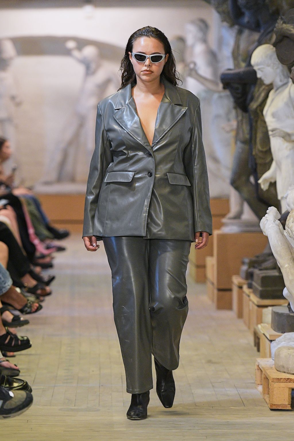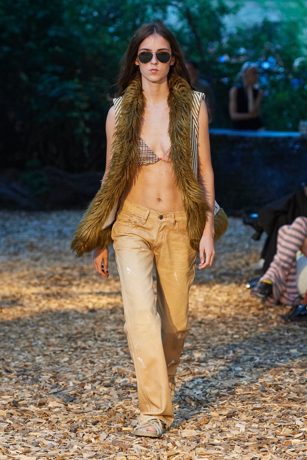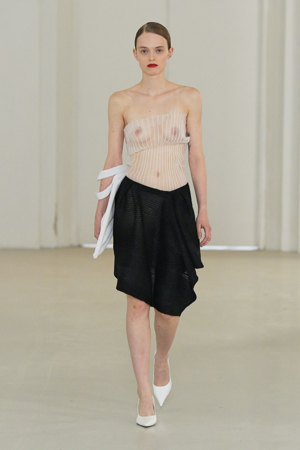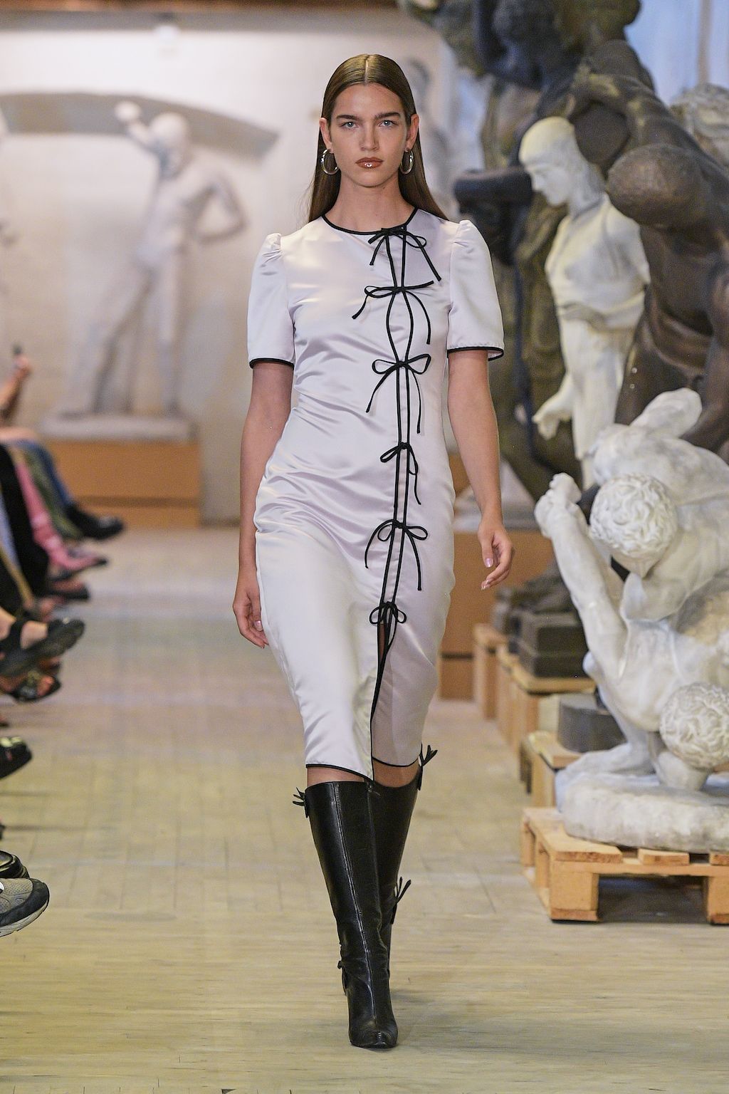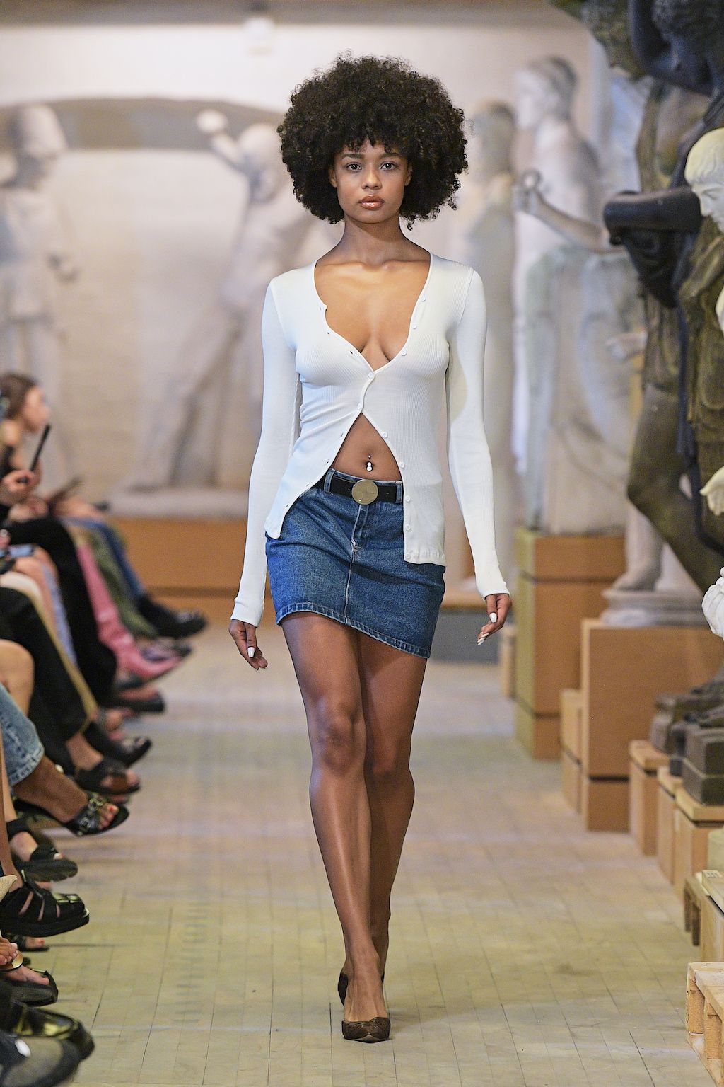In addition, other leitmotifs of Expressionism can be found in her inspiration for the collection, such as an enthusiasm for decay in nature and beauty of the imperfect. The collection included bleached and hand-dyed denim pieces, monogramed and gradient fine knits, distressed knitwear and leather fastenings. All looks were presented by the models wearing heels by Dutch leather brand Wandler.
