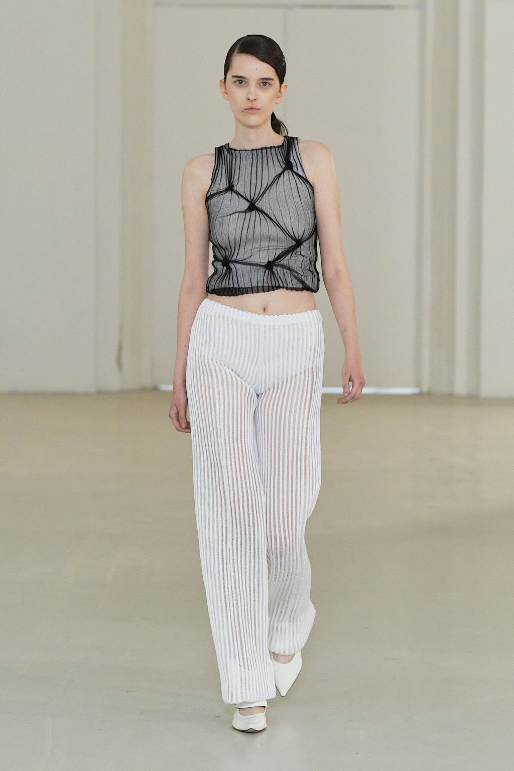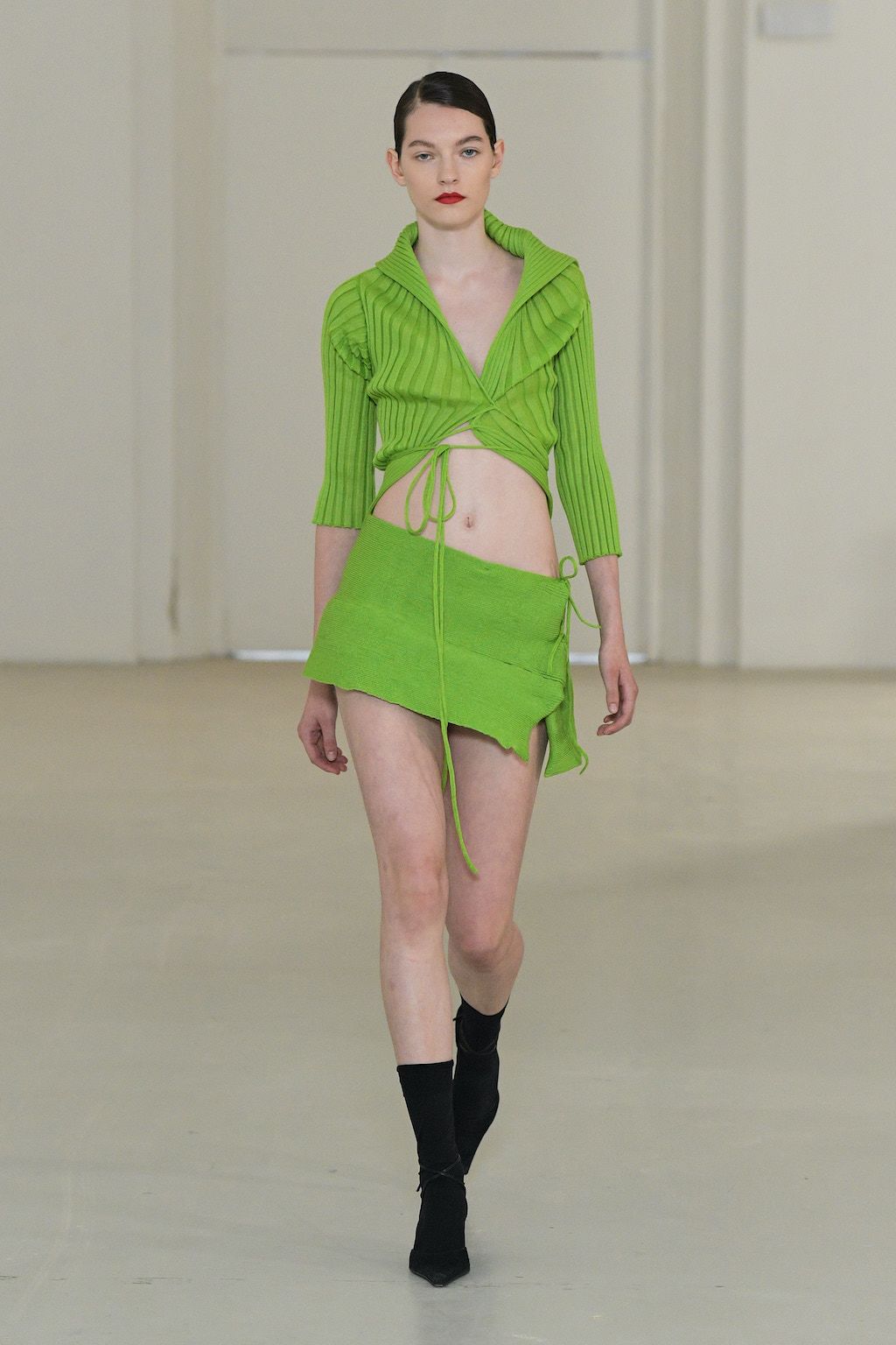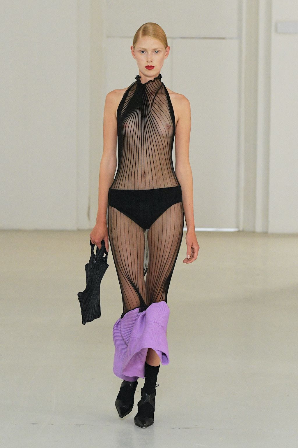 Danish knitwear designer Amalie Røge Hove showcased her 8th collection during this season of CPHFW. Røge Hove’s craftsmanship is based on the iteration of yarn loops that are tied repeatedly shaping garments that envelop the body. She proves that knitwear does not need to have a traditionally soft expression, but that it can also be crafted into pieces with sharp edges and almost architectural shapes. By using different yarns, densities and techniques, she challenges our visual perception of color firstly tapping into bolder tints such as lilac and apple green in contrast to her usual rather monochromatic color palette.