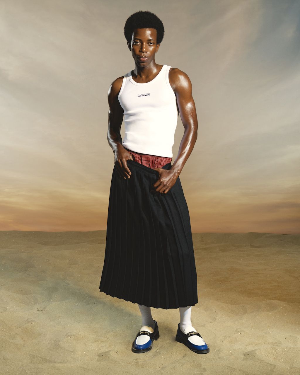 Comprising four distinct pieces, this capsule collection is accompanied by a campaign that defies conventional labels and celebrates energy as a fluid manifestation of identity. It endeavors to showcase that individuals are defined by the energy they emit into the world. The collection revolves around energy and draws inspiration from the glam-punk era, infusing a rugged yet chic aesthetic. It is highlighted through a workwear-inspired shirt, leopard print shorts, a cropped tank top, and a pair of loafers, all showcasing DAGGER’s signature blue colorway.