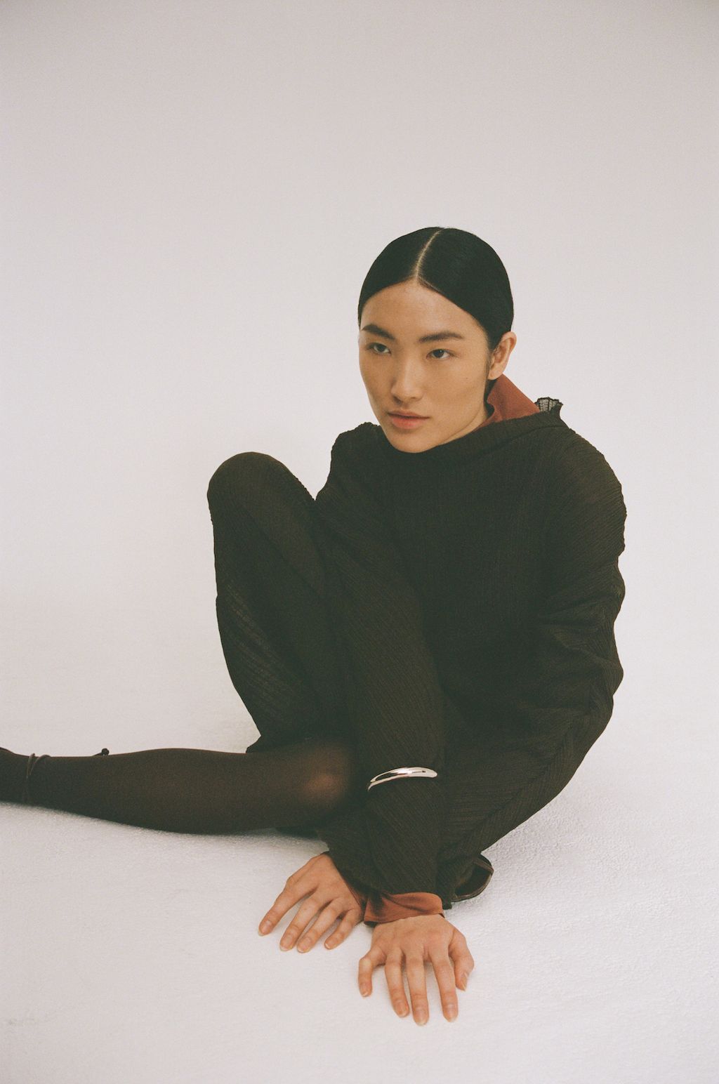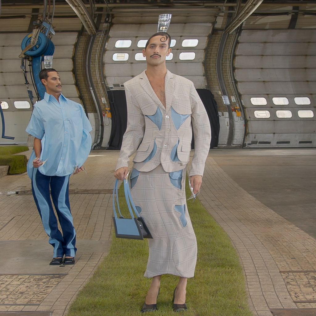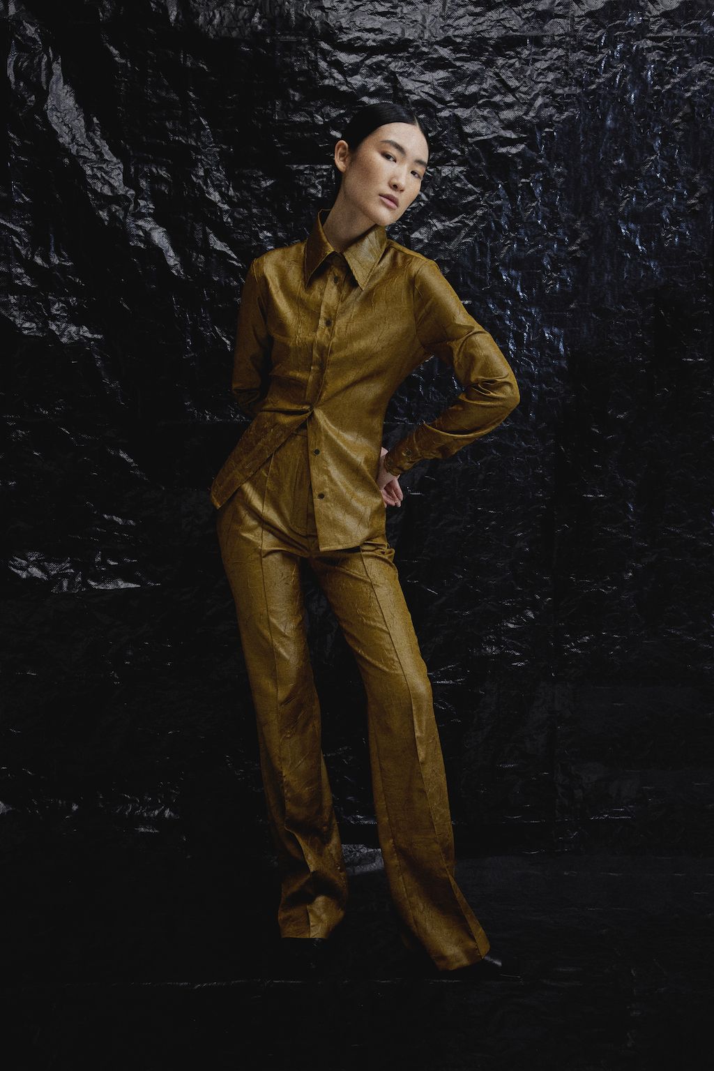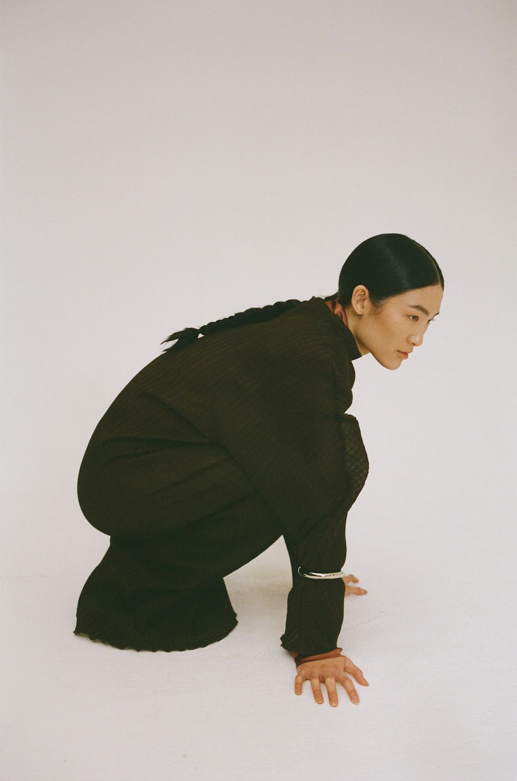 The next Amsterdam addition is label Ninamounah headed by Ninamounah Langestraat and Paiman Azizi. Uncommonly, the designer with Indonesian roots initially started studying biology before she found her passion in textile design and philosophy at Rietveld Academy. Most people who dramatically change their academic path, wouldn’t look back to their initial choice - not Ninamounah though. The designer does not feel like compromising on either of the two disciplines. She even calls herself “a biologist that uses fashion as a medium”. In other words, Ninamounah uses biological methods in order to dissect the deeper layers of the cultural mantle found in fashion design. In her work she strongly outlines the animalistic characteristics in humanity and states that “we are all animals wearing a dress of culture”. Reappearing styles in her collections are leather motor suits, French corsetry and pinstripe tailoring. The brand returns to The Fashion Olymp which is Paris Fashion Week after their successful début earlier this year. It would have not been a Ninamounah collection though, if she did not incorporate her sometimes very cruel and brutal references of flora and fauna. The SS23 collection titled “The Gatherers” roots in Ninamounah’s fascination for carnivorous plants such as the Venus flytrap and pitcher plants devouring their prey in the dissolving liquids inside the plant. Her tailoring pieces evoke the impression of roots, while some cut outs seemingly look like bites from carnivorous plants.