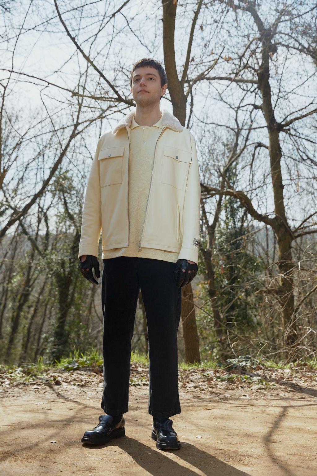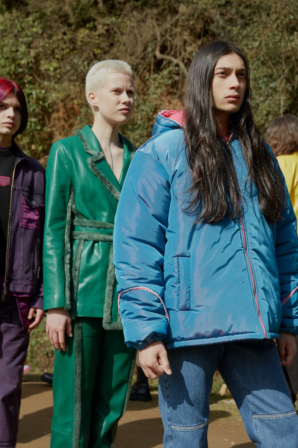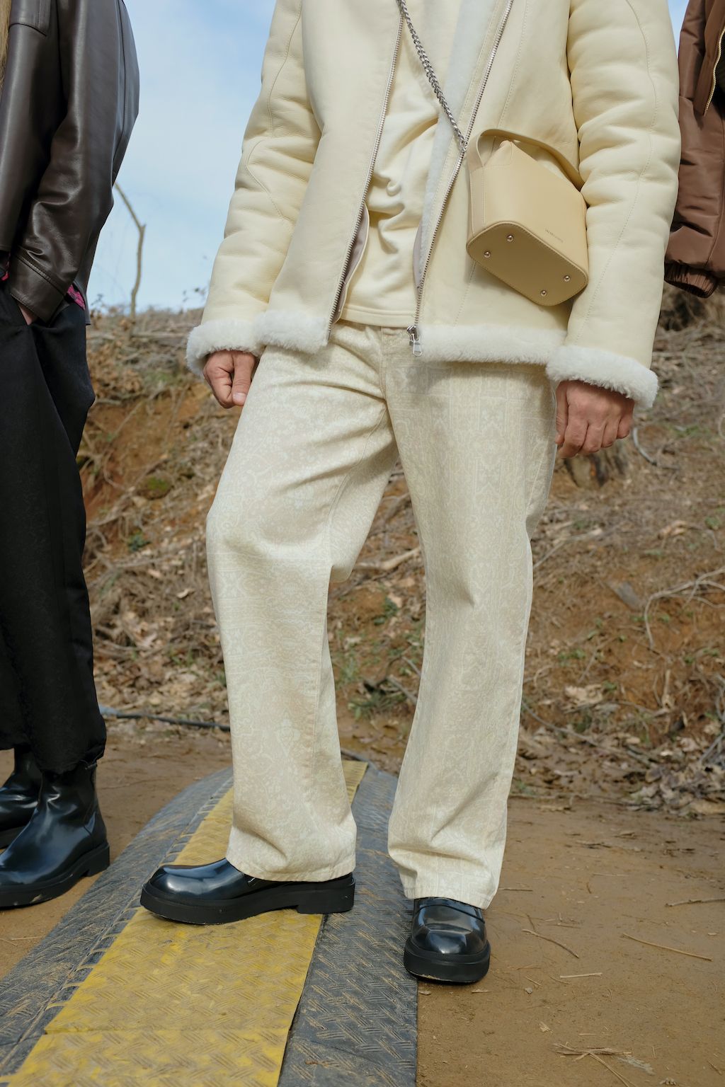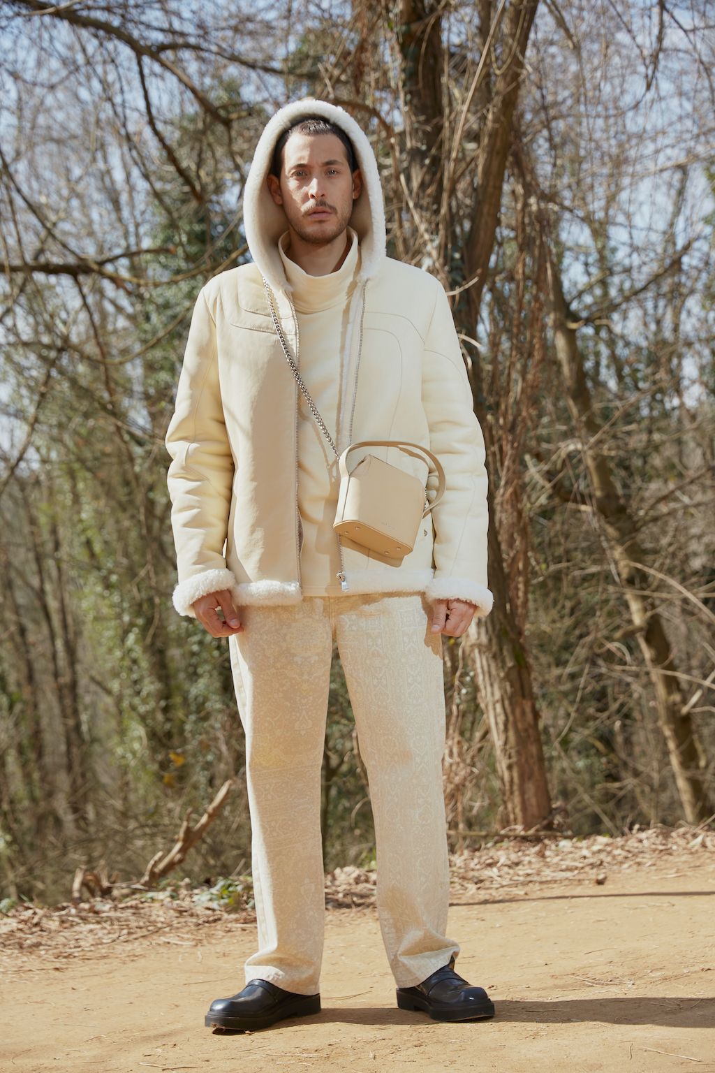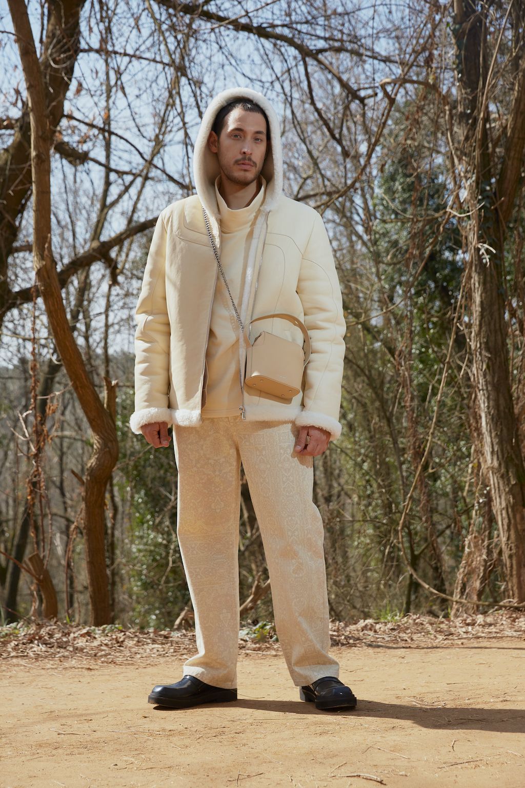 Raw and utilitarian aesthetics are therefore at the core of this collection, which is why Aydin set his mind on experimenting with natural fabric treatments that come with an artisanal feel. The menswear and womenswear staples from this collection include distressed carpet jacquard, oil spill prints on polar fleece, natural shimmery cupro, printed denim, light woven knitwear, and vegetal leather.