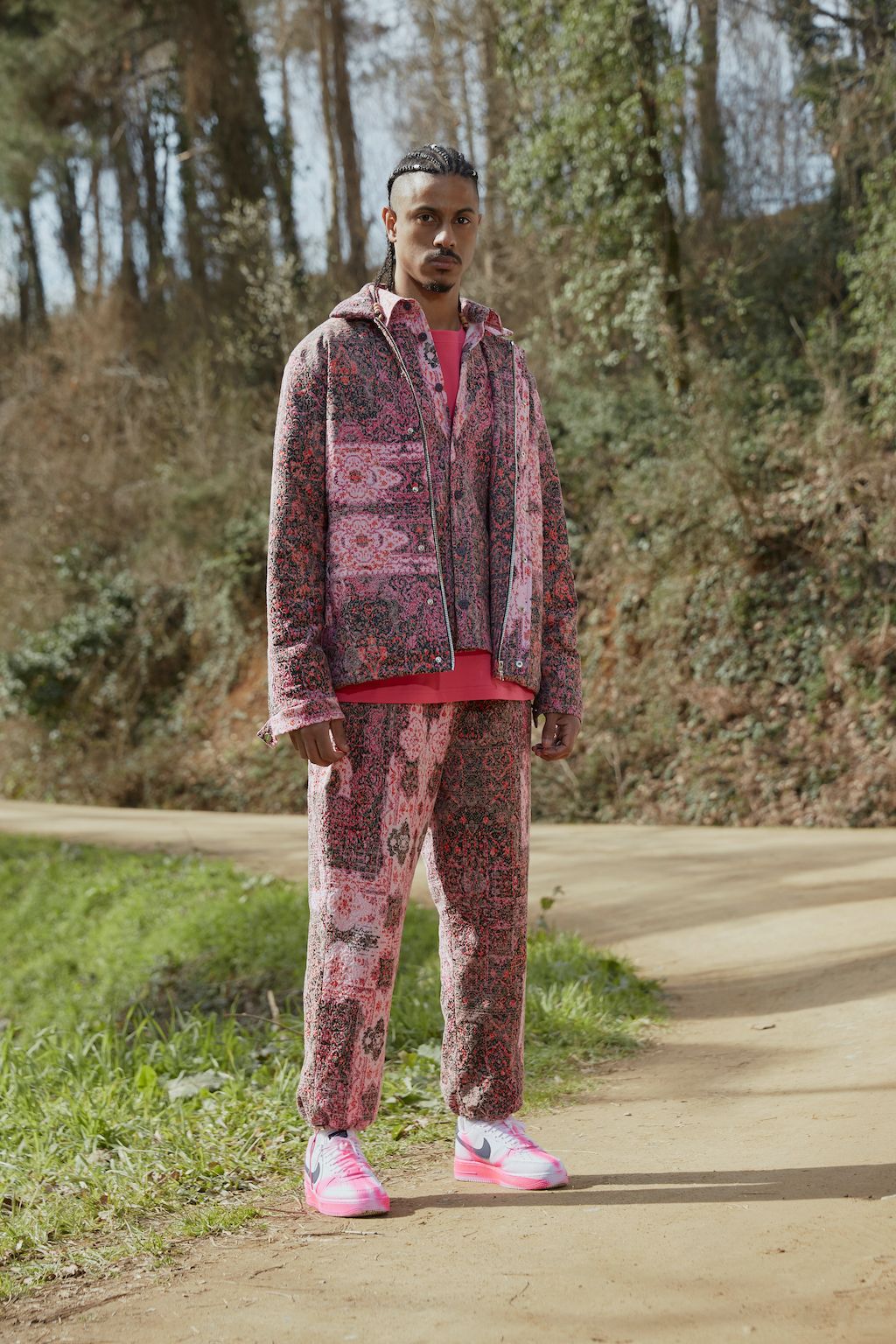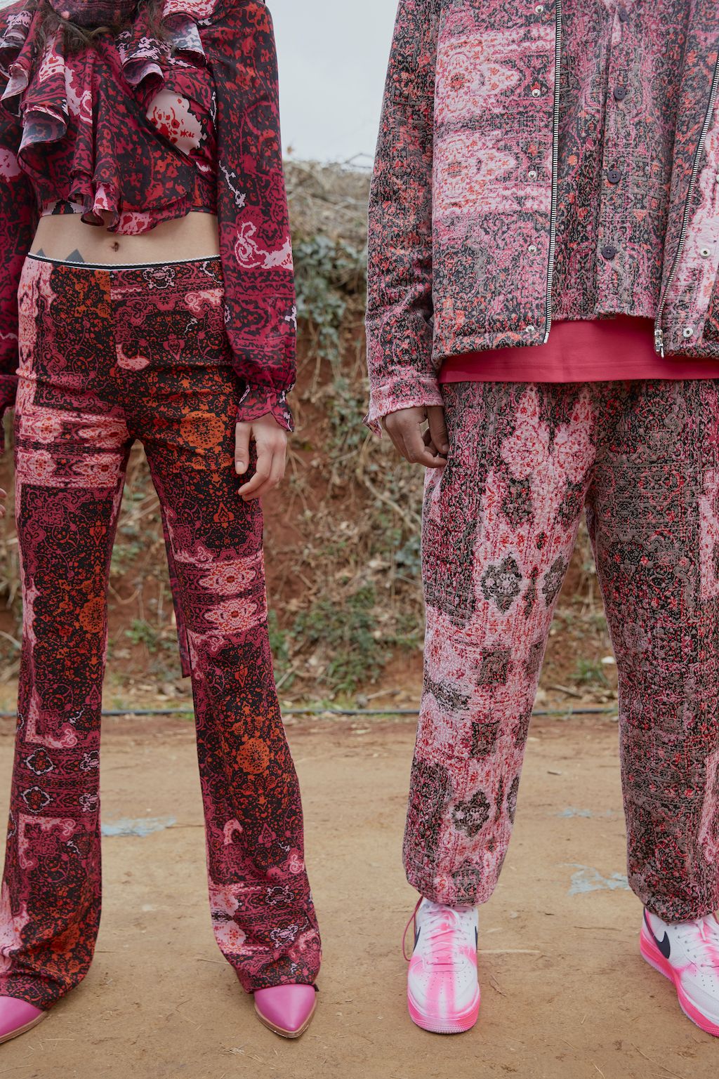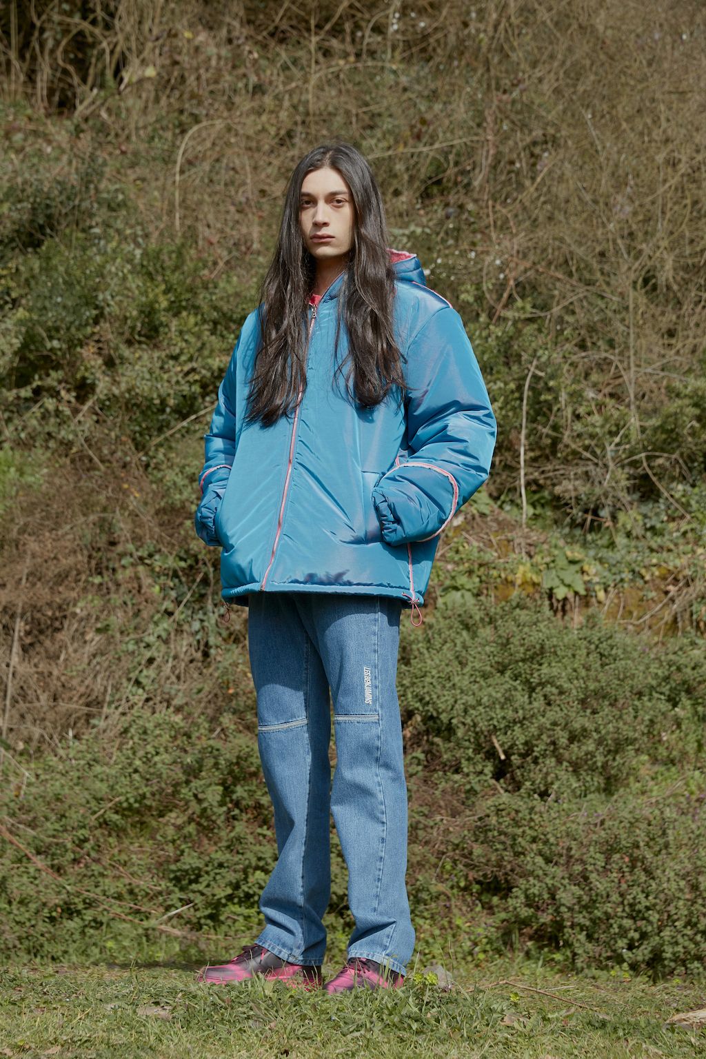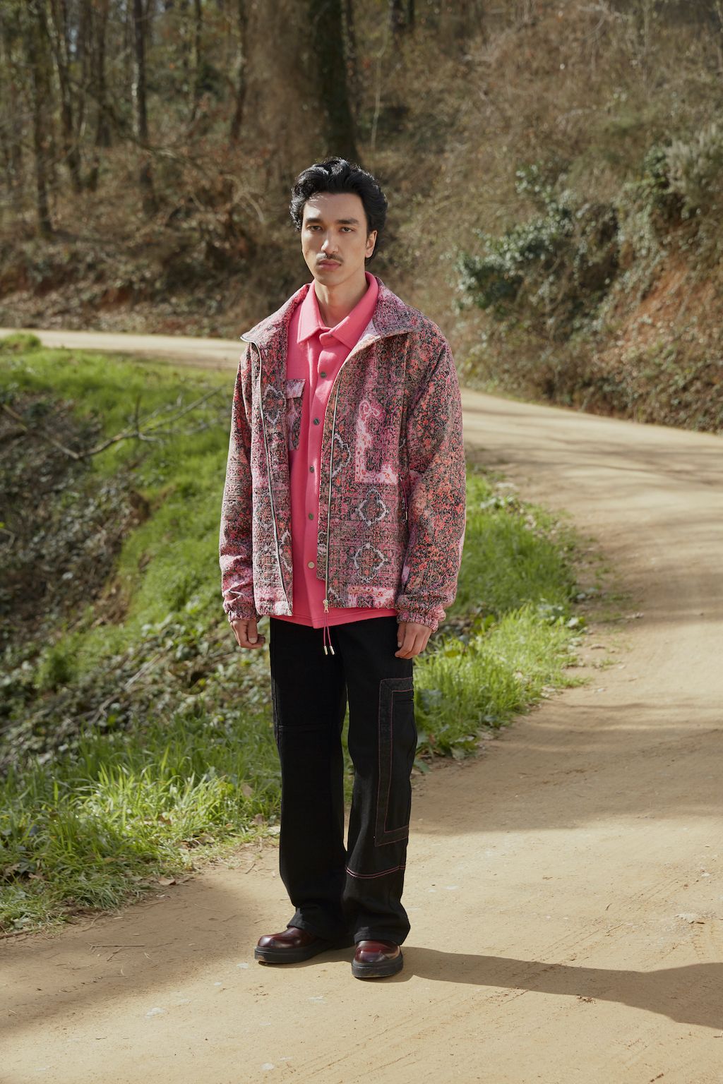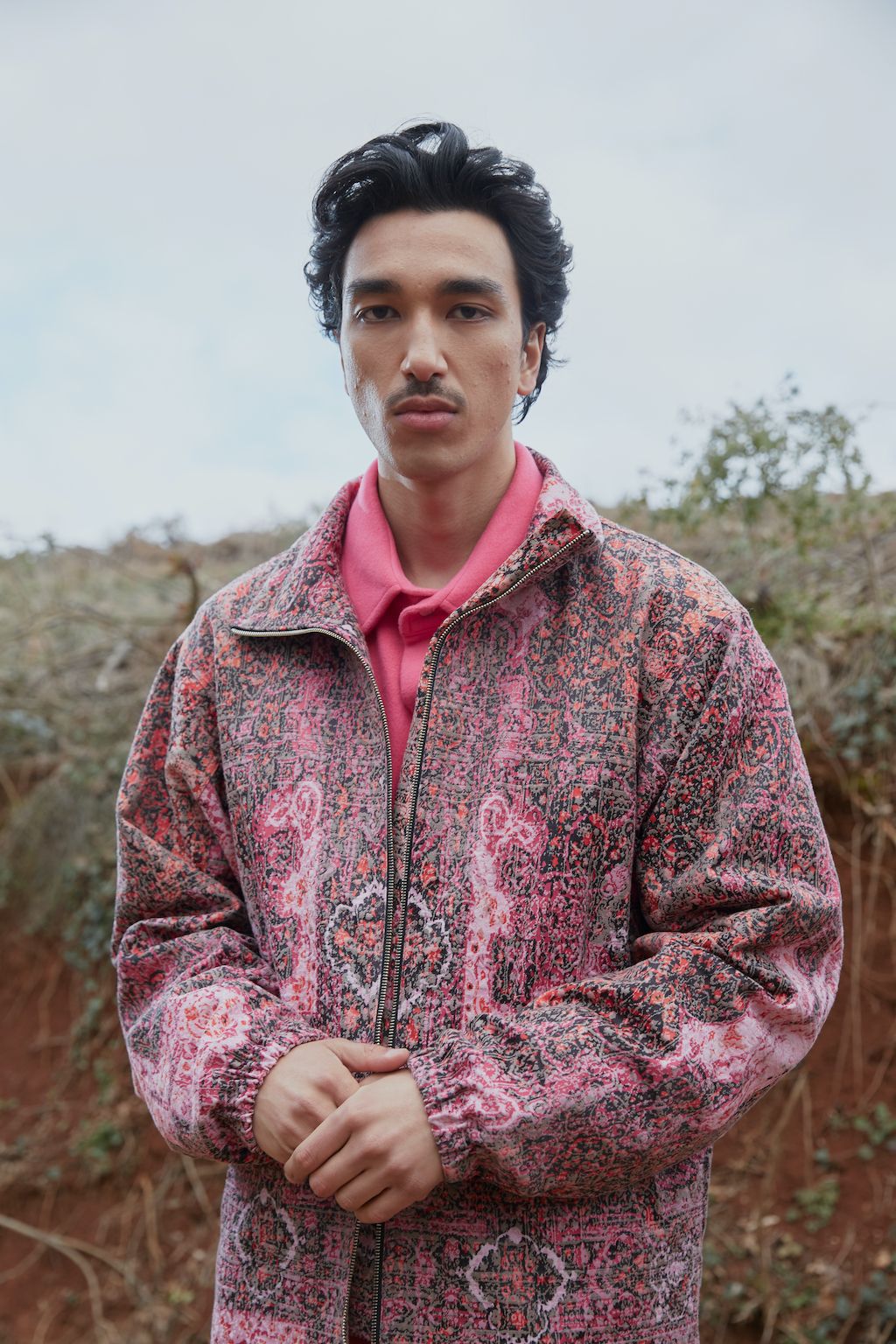 Raw and utilitarian aesthetics are therefore at the core of this collection, which is why Aydin set his mind on experimenting with natural fabric treatments that come with an artisanal feel. The menswear and womenswear staples from this collection include distressed carpet jacquard, oil spill prints on polar fleece, natural shimmery cupro, printed denim, light woven knitwear, and vegetal leather.