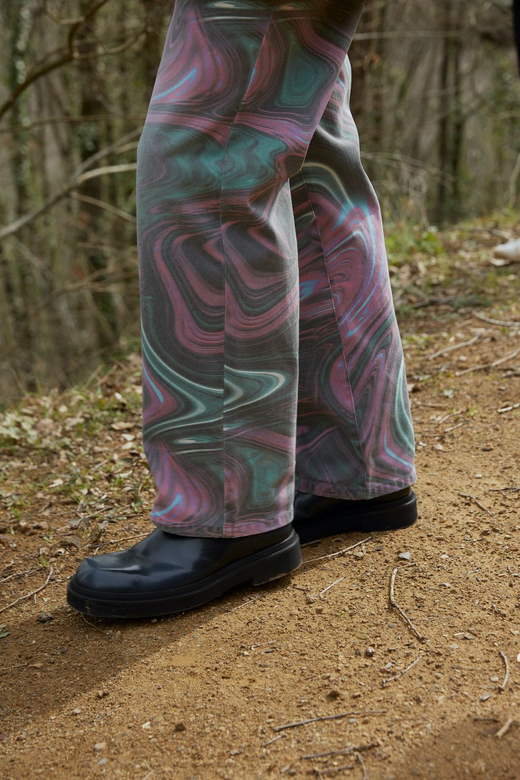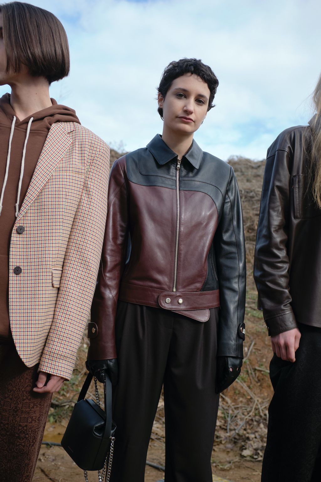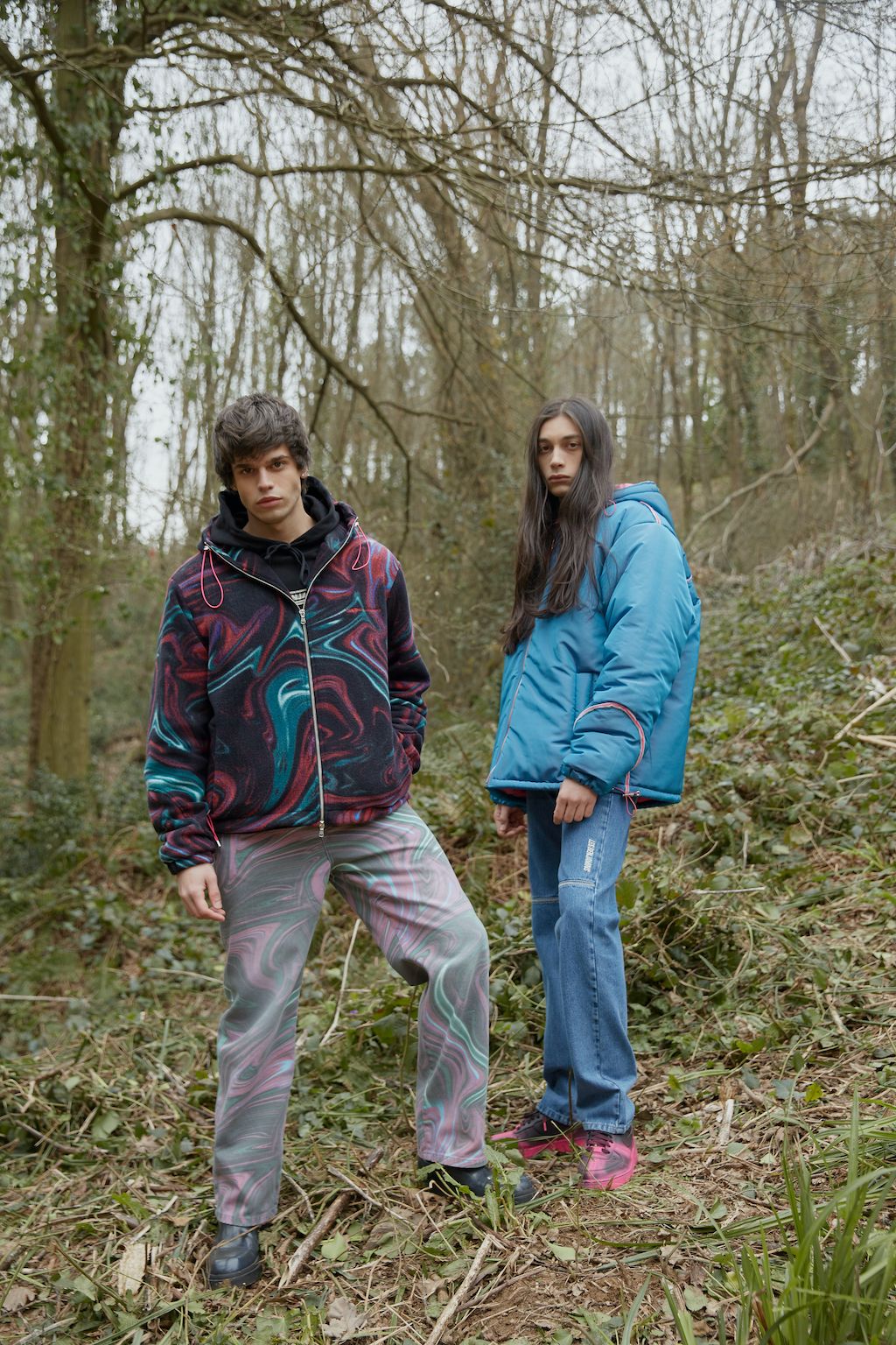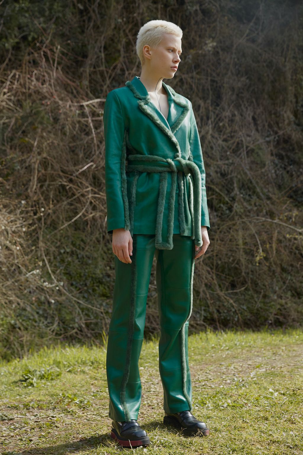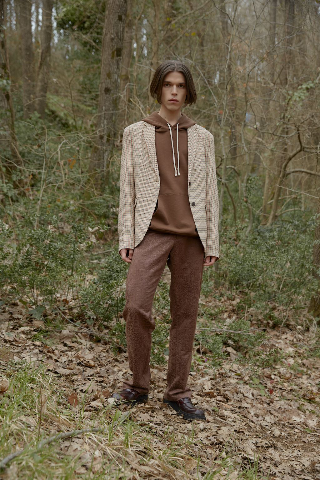 Raw and utilitarian aesthetics are therefore at the core of this collection, which is why Aydin set his mind on experimenting with natural fabric treatments that come with an artisanal feel. The menswear and womenswear staples from this collection include distressed carpet jacquard, oil spill prints on polar fleece, natural shimmery cupro, printed denim, light woven knitwear, and vegetal leather.