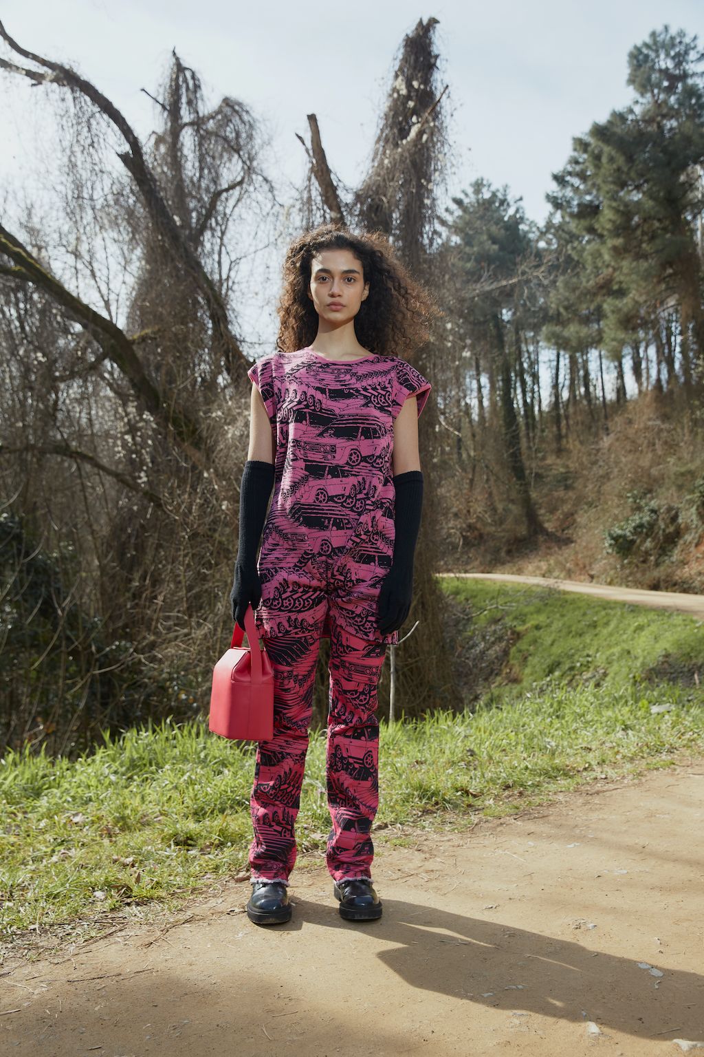 Defined in two chapters — “rally-style” and “crash & repair” — the collection's garments narrate the entire cycle of a rally, from the pilot’s mental preparation to the actual race. In this context, style and performance are the collection's spiritual and functional pillars and are translated into a rich range of tailored silhouettes, experimental textures, and bold patterns in earthy hues with eye-popping dashes of magenta.