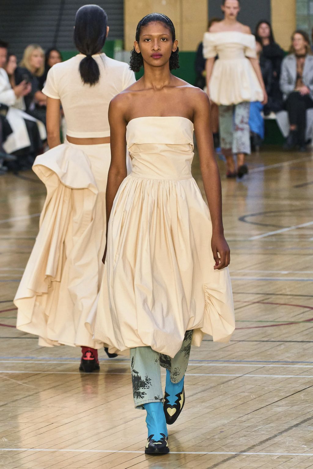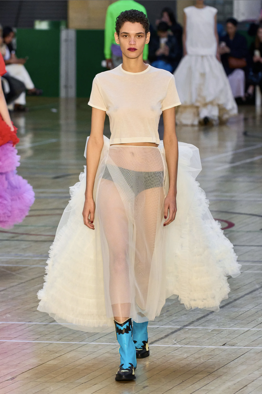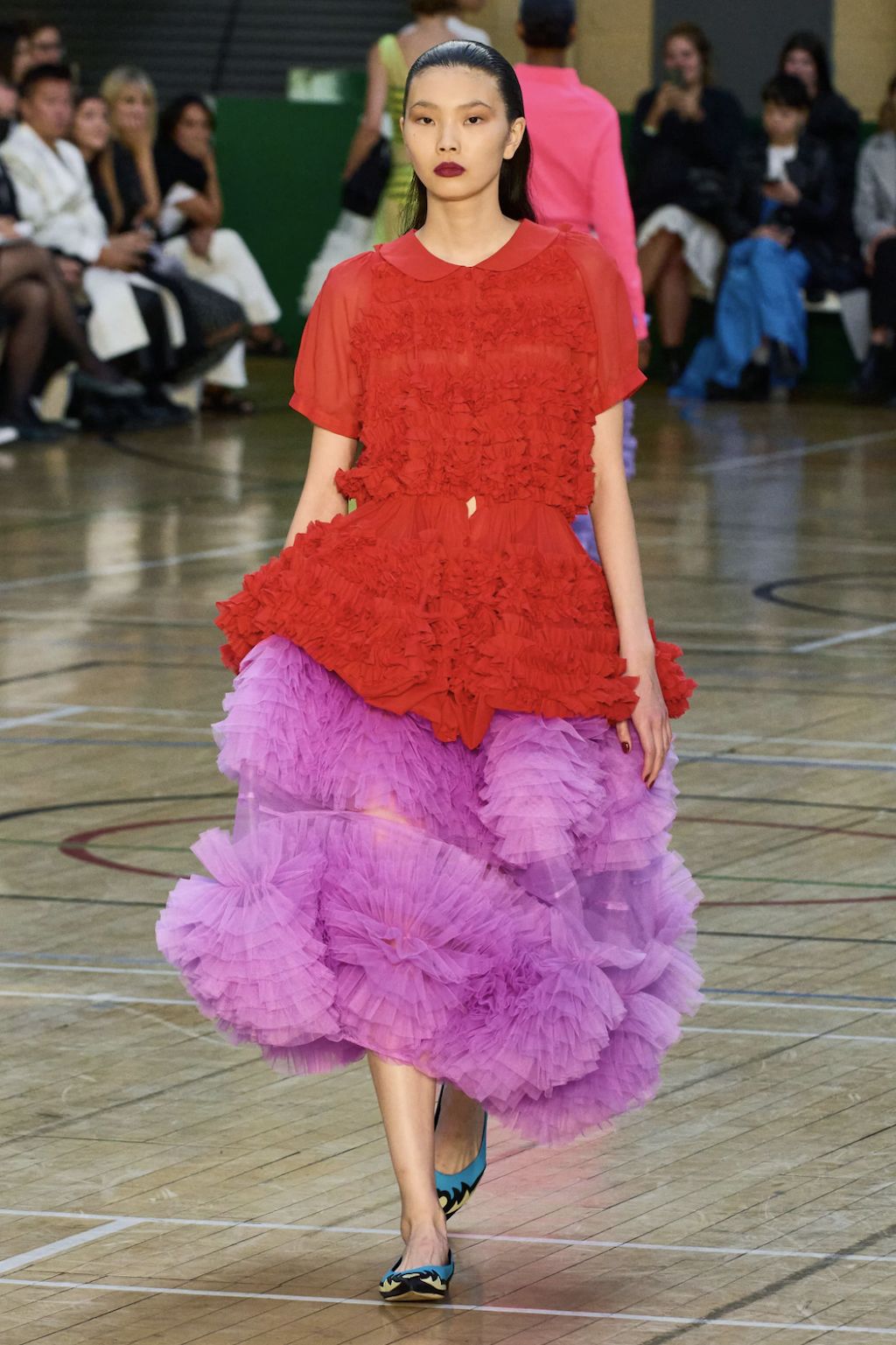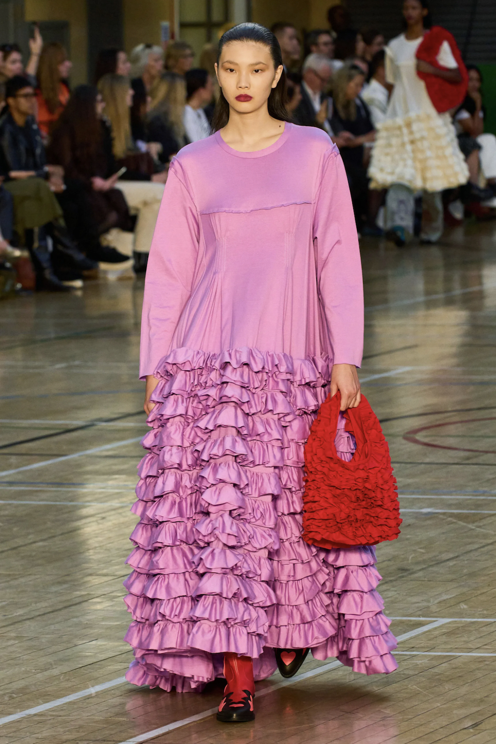 → Molly Goddard’s SS23 collection was a love letter to contrasts. Dresses and skirts as we all know and love them from her started the show. Next came the return of the dress-overjeans trend, seen here styled with bold cowboy boots - an interplay the way we love it. As the undisputed ruler of British babydoll dresses, Molly Goddard surprised everyone with her unusual shapes. For the first time, she showed fan-favourite tulle pieces as well as clean lines in suits and retro-collared cardigans, even jeans. Followed by a neon tulle takeover with slip dresses paired with clashing bee stripe undergarments and the most divine contrasting red top and lilac skirt, the show finished with a classic bridal ending showcasing a larger-than-life tulle dress fit for a modern fashion bride. Molly Goddard gave us everything we expected and delivered, even more, injected with a sense of quirk and fun thanks to her poppy color palette, which screams “It’s a Molly Goddard” even from far away.