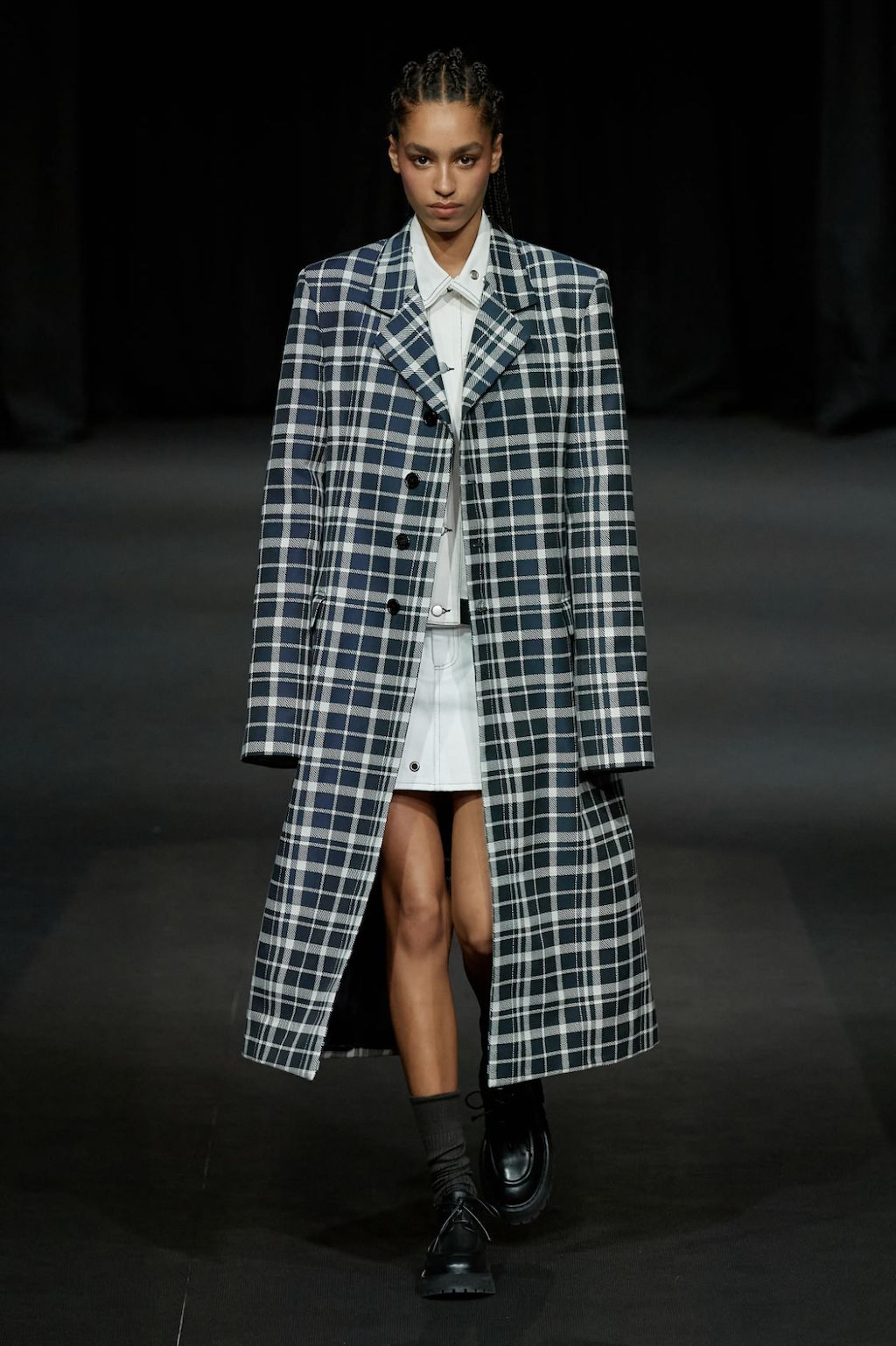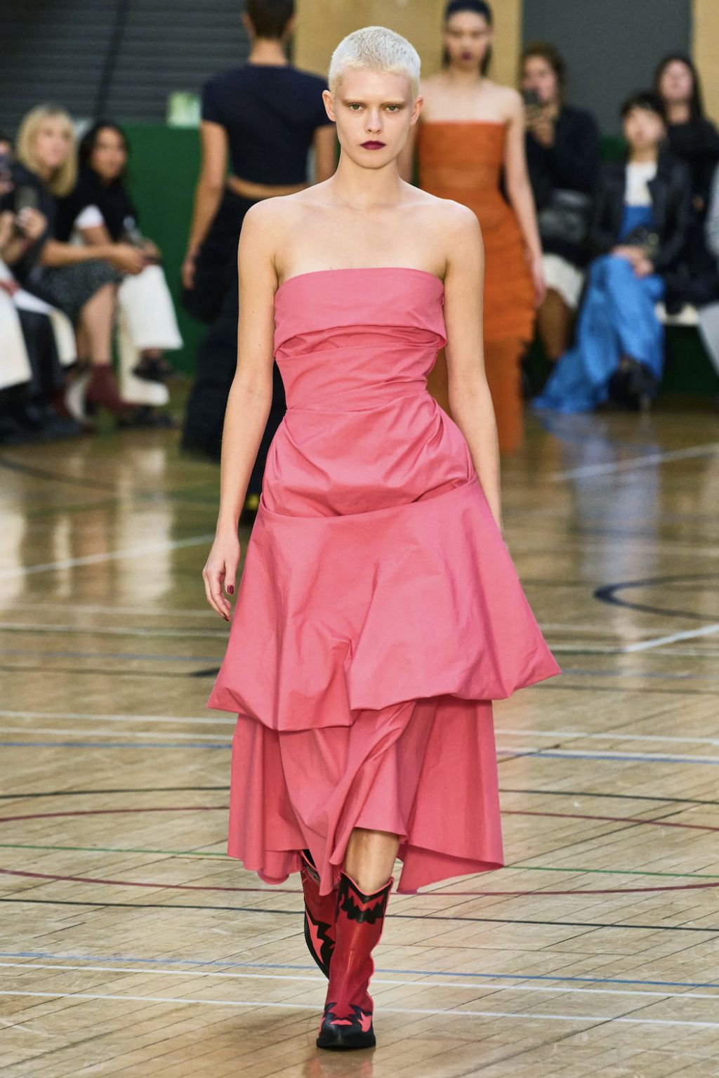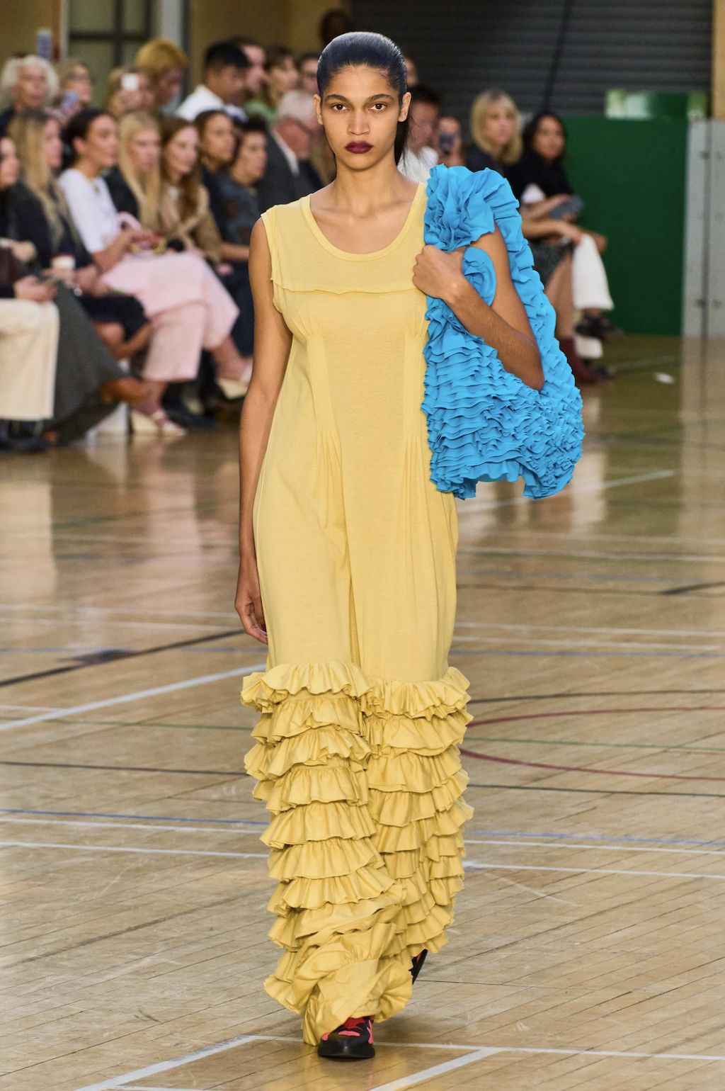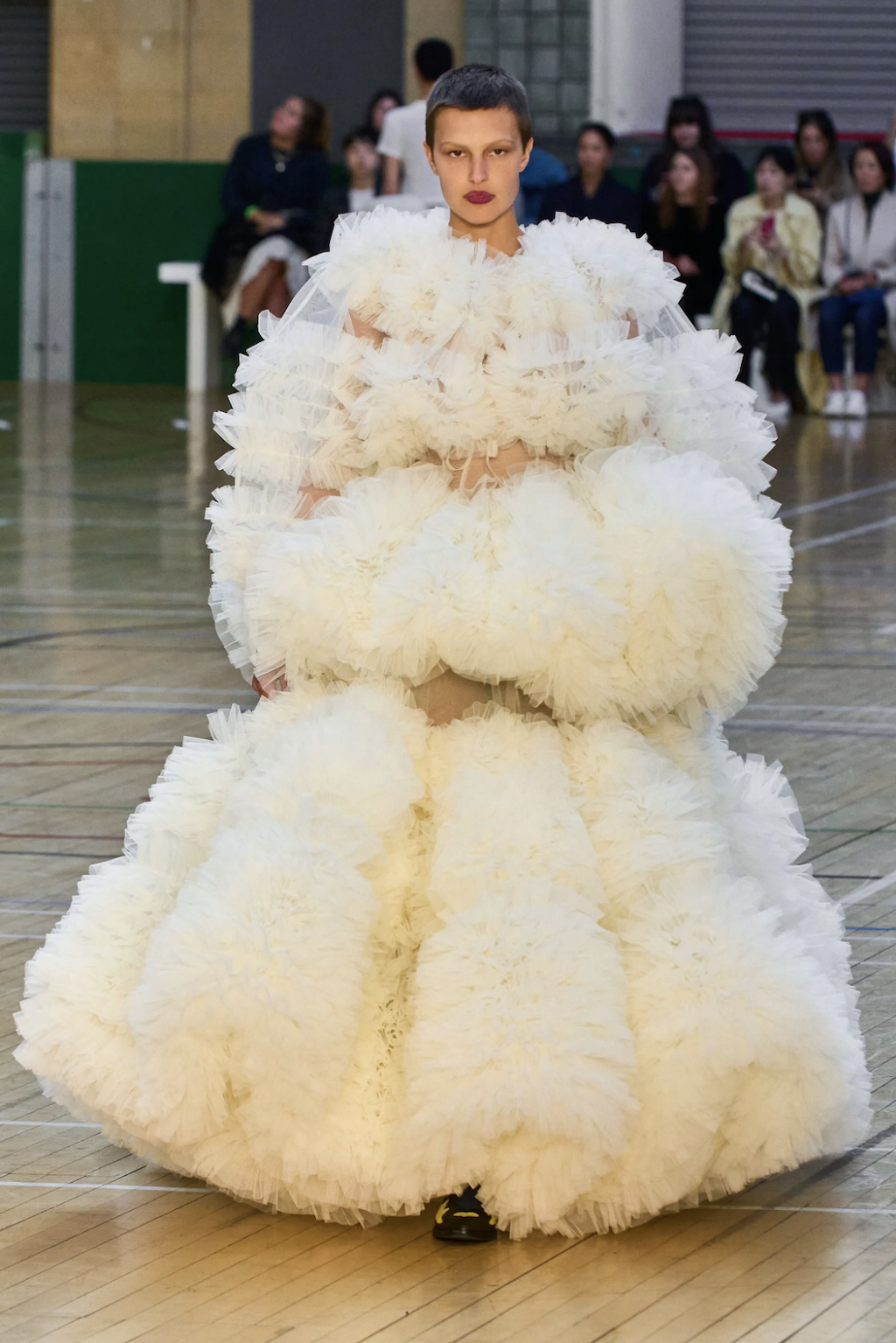 → Molly Goddard’s SS23 collection was a love letter to contrasts. Dresses and skirts as we all know and love them from her started the show. Next came the return of the dress-overjeans trend, seen here styled with bold cowboy boots - an interplay the way we love it. As the undisputed ruler of British babydoll dresses, Molly Goddard surprised everyone with her unusual shapes. For the first time, she showed fan-favourite tulle pieces as well as clean lines in suits and retro-collared cardigans, even jeans. Followed by a neon tulle takeover with slip dresses paired with clashing bee stripe undergarments and the most divine contrasting red top and lilac skirt, the show finished with a classic bridal ending showcasing a larger-than-life tulle dress fit for a modern fashion bride. Molly Goddard gave us everything we expected and delivered, even more, injected with a sense of quirk and fun thanks to her poppy color palette, which screams “It’s a Molly Goddard” even from far away.