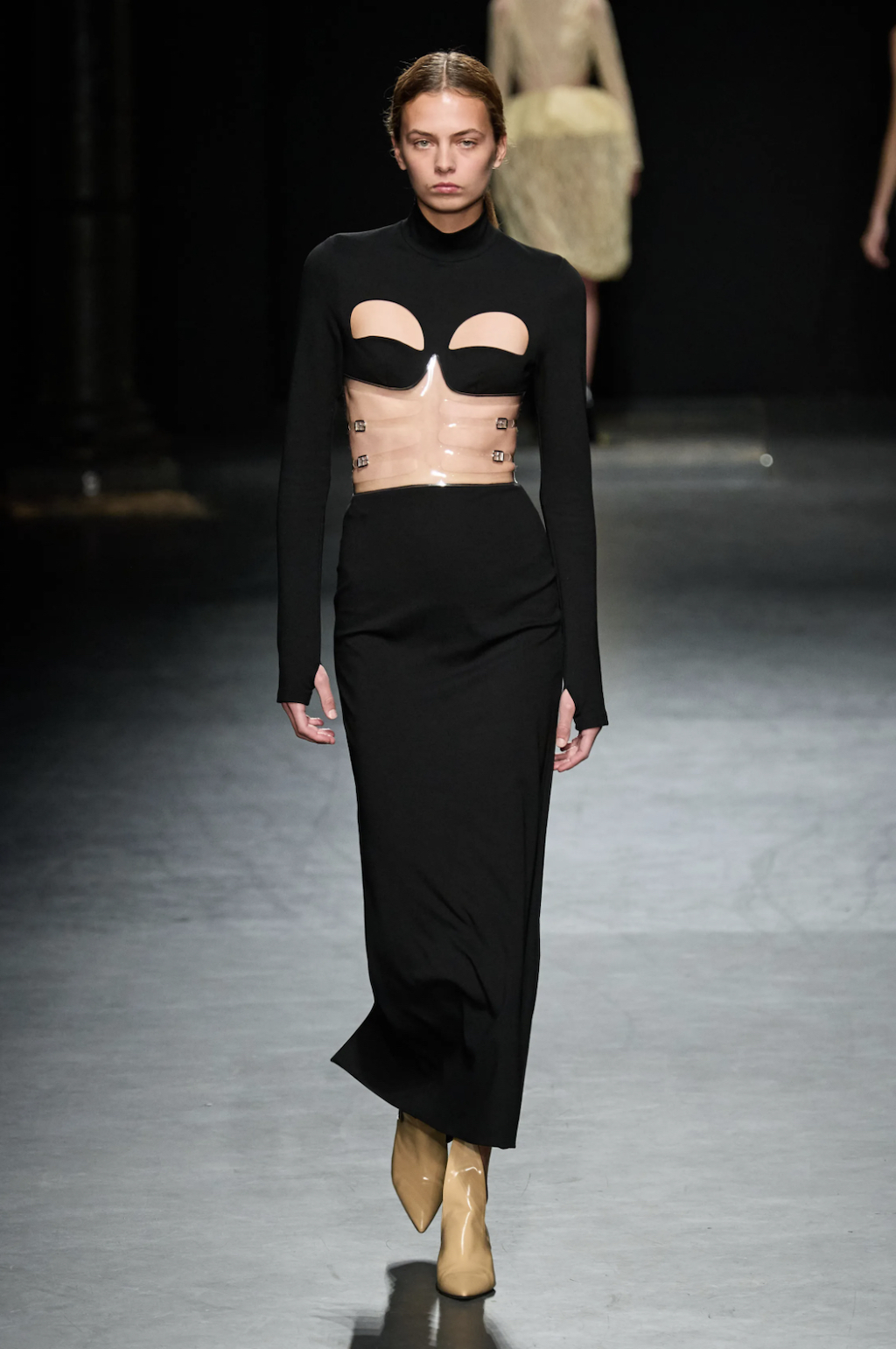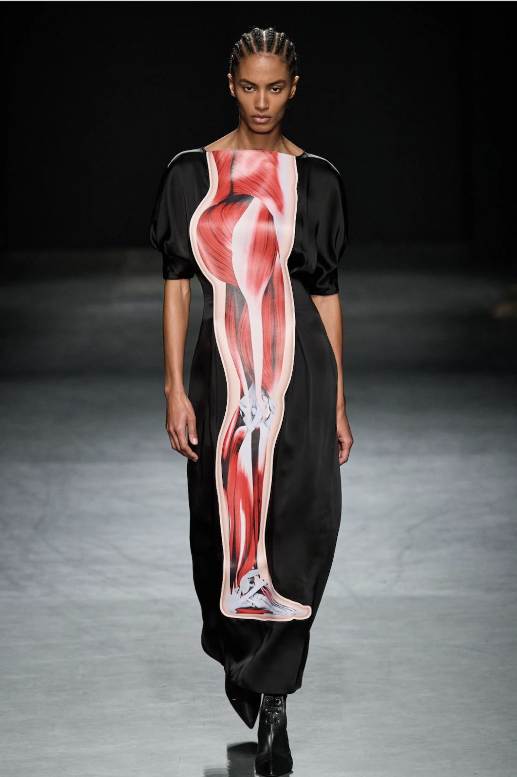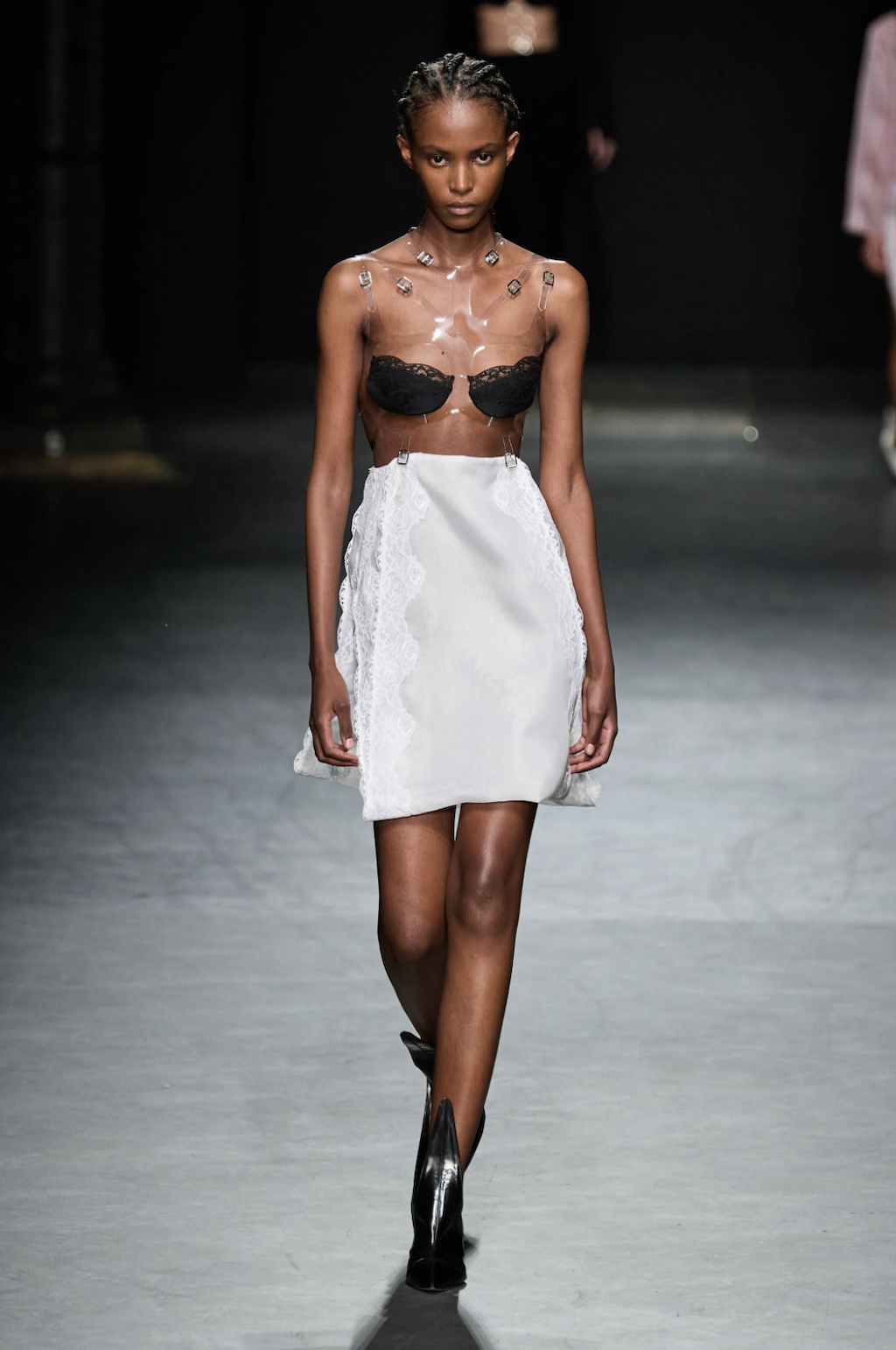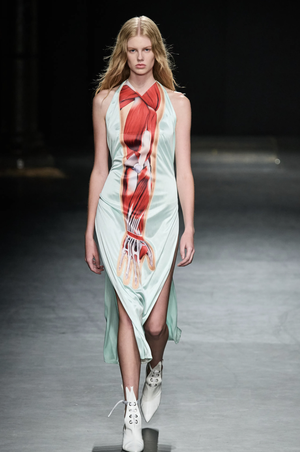 → Back on the London fashion week schedule with a bang, Scottish fashion designer Christopher Kane riffed on some of his own past collections for Spring/Summer 2023. Highlights included subversive twinsets, lingerie, floral stickers, skeleton-like PVC-straps, and crystal chainmail. Science, nature and the human body were cited as inspirations, and there were anatomical cross-section drawings (symbolic of power and strength) of hands, arms, and legs to decorate dresses looking like minimalist nurse and physician uniforms. Sexy dresses were everywhere in London, from bodycon to lingerie-inspired. Kane’s were some of the best in show - think clear vinyl body straps with inset lace bra cups. He also had a cozy dose of oversized knitwear and wowzer cutaway Chelsea boots, because sometimes, we just wanna get dressed and feel cool without having to think about it.