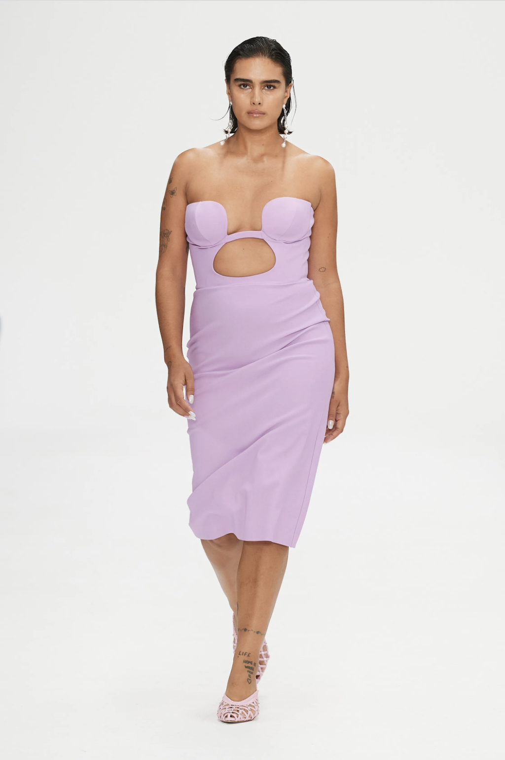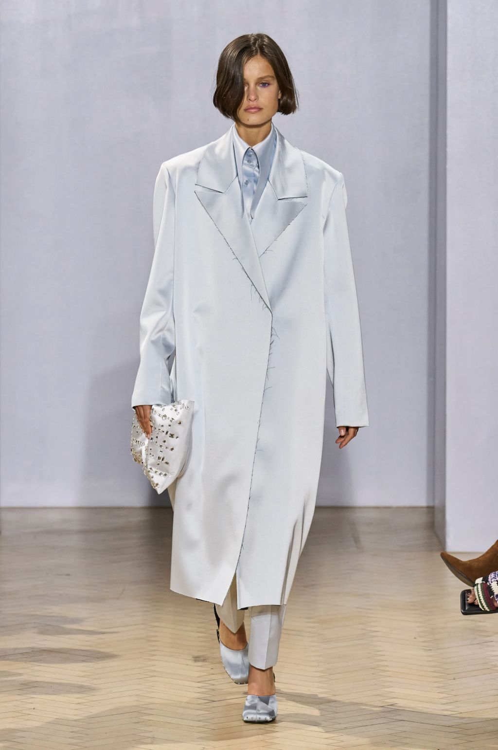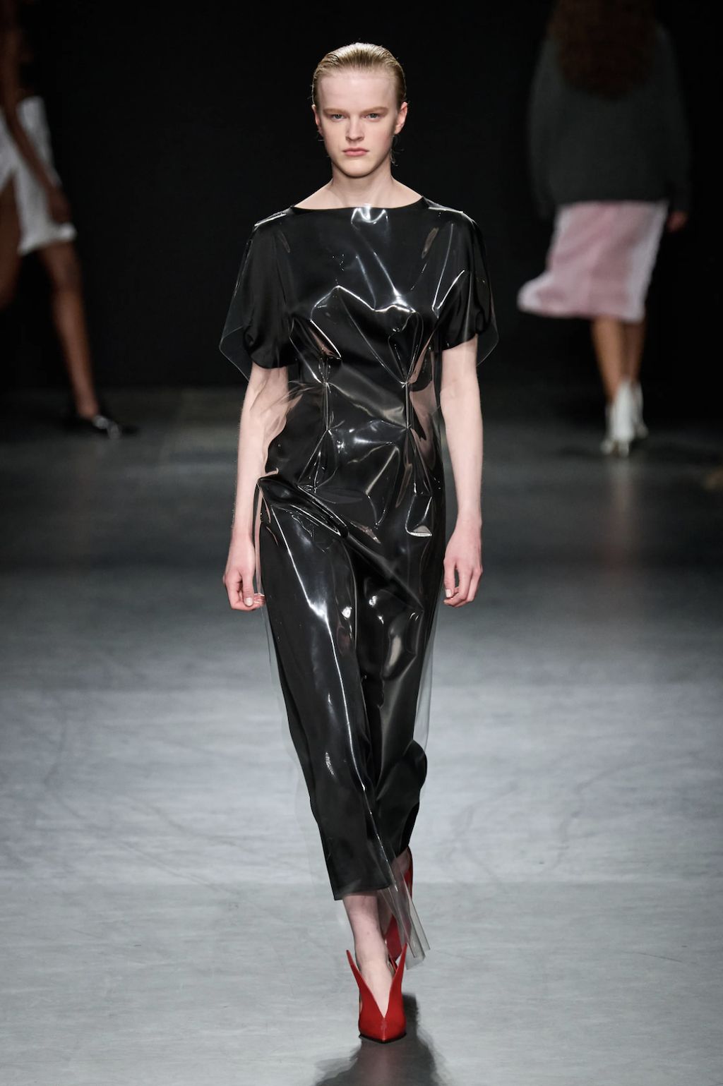 → Back on the London fashion week schedule with a bang, Scottish fashion designer Christopher Kane riffed on some of his own past collections for Spring/Summer 2023. Highlights included subversive twinsets, lingerie, floral stickers, skeleton-like PVC-straps, and crystal chainmail. Science, nature and the human body were cited as inspirations, and there were anatomical cross-section drawings (symbolic of power and strength) of hands, arms, and legs to decorate dresses looking like minimalist nurse and physician uniforms. Sexy dresses were everywhere in London, from bodycon to lingerie-inspired. Kane’s were some of the best in show - think clear vinyl body straps with inset lace bra cups. He also had a cozy dose of oversized knitwear and wowzer cutaway Chelsea boots, because sometimes, we just wanna get dressed and feel cool without having to think about it.