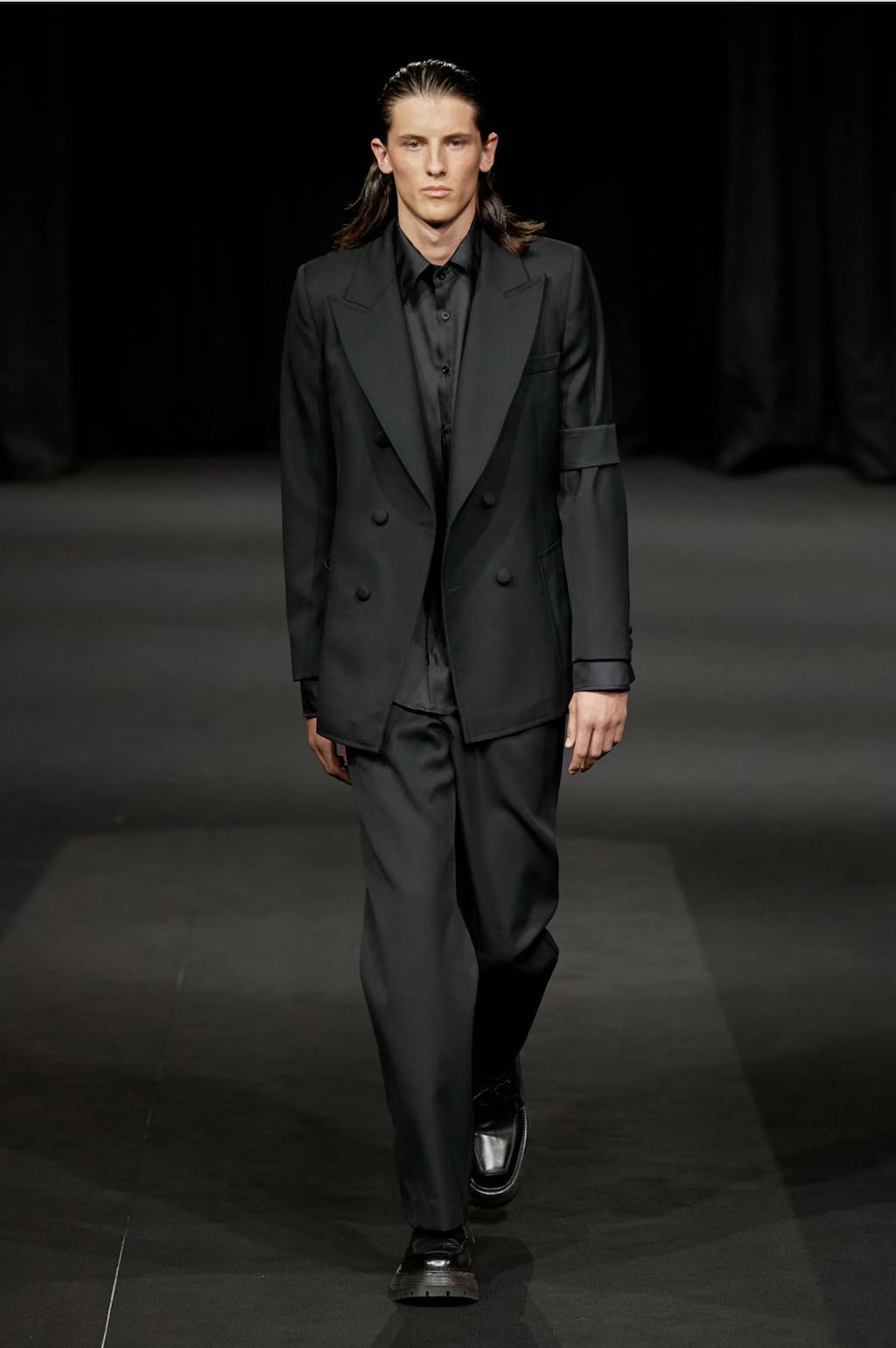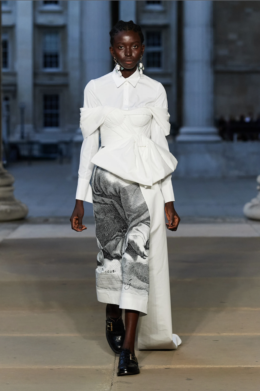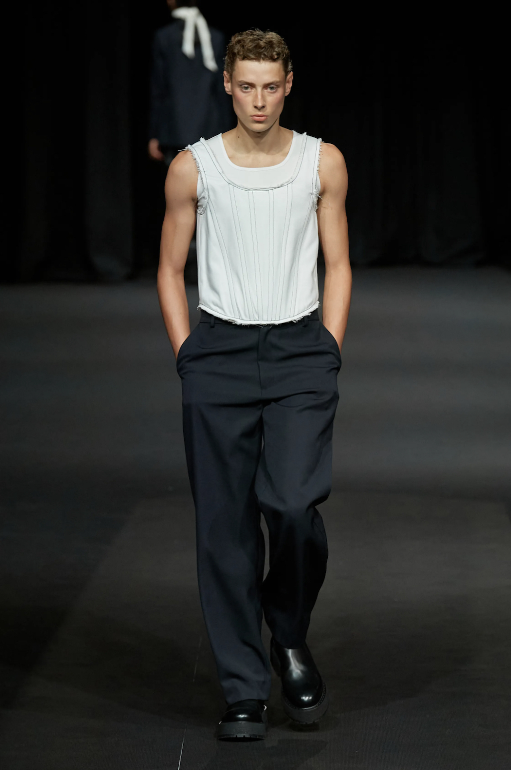 → Following a one-minute silence opening his show with a solemn tribute to Her Majesty the Queen, Daniel W. Fletcher paid homage to figures past and present who have made London their home - from King’s Road punks to Savile Row tailors. But also the initially very dark designs are reminiscent of the mourning for Elizabeth II.’s passing, especially the all-black morning suit worn with an armband to tribute to the Queen, opening his Spring/Summer 2023 show. Ever since Netflix’s hit series “Next in Fashion”, we have appreciated his skills. His craftsmanship is truly exceptional. No question the tailoring-focused SS23-collection referenced past and present silhouettes by mixing corsets and pyjama shirts with classic suiting. This was Fletcher’s most sustainable collection to date, working with deadstock fabrics through Nona Source, which sources waste fabrics from LVMH to repurpose elsewhere. A big yes from us!