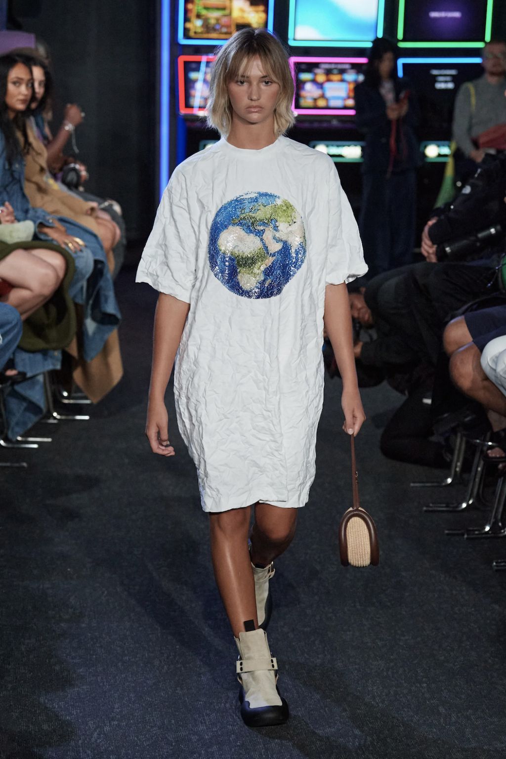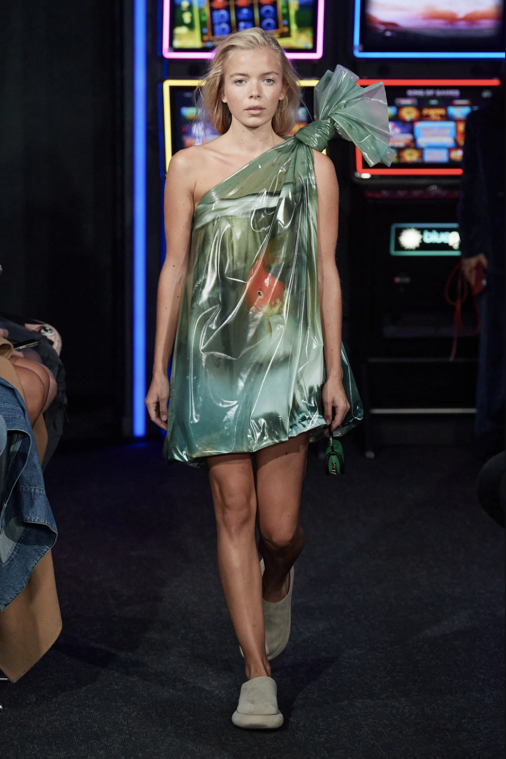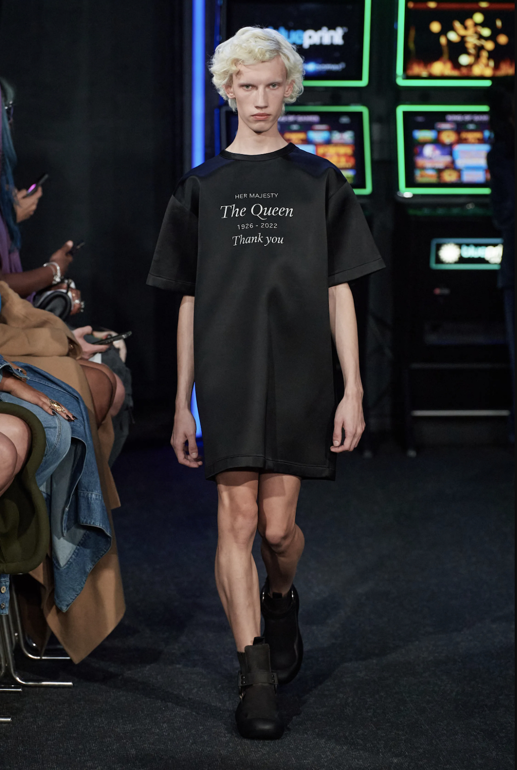 → Fashion designer Jonathan William Anderson hit the home run. After leaving England’s fashion capital London to showcase in Milano, he came back for one of the most intimate runways of the season. Beyond glaring neon nights and many more dazzling show guests, JW Anderson took over a whole casino crusade, the Las Vegas Arcade in London’s Soho. The bright lights that decorate the streets outside were emulated inside, with slot machines and big-winning games shining their intoxicating glimmer onto the makeshift runway. The energy was pumping in the room before we’d even seen the clothes, in turn gearing us up for one of the standout shows of the season. JW Anderson fused fashion with fun in its purest form, including dresses complete with plastic bags of pet fish, selfie-inspired shimmering orbs, and retro keyboard keys. Offering a general sense of juxtaposition throughout, JW Anderson’s SS23 was equal parts oversized and form-fitting, dramatic and subtle, unhinged and incredible. The show ended with a tribute to Her Majesty Queen Elizabeth II. Check out the final look of his SS23-collection for this!