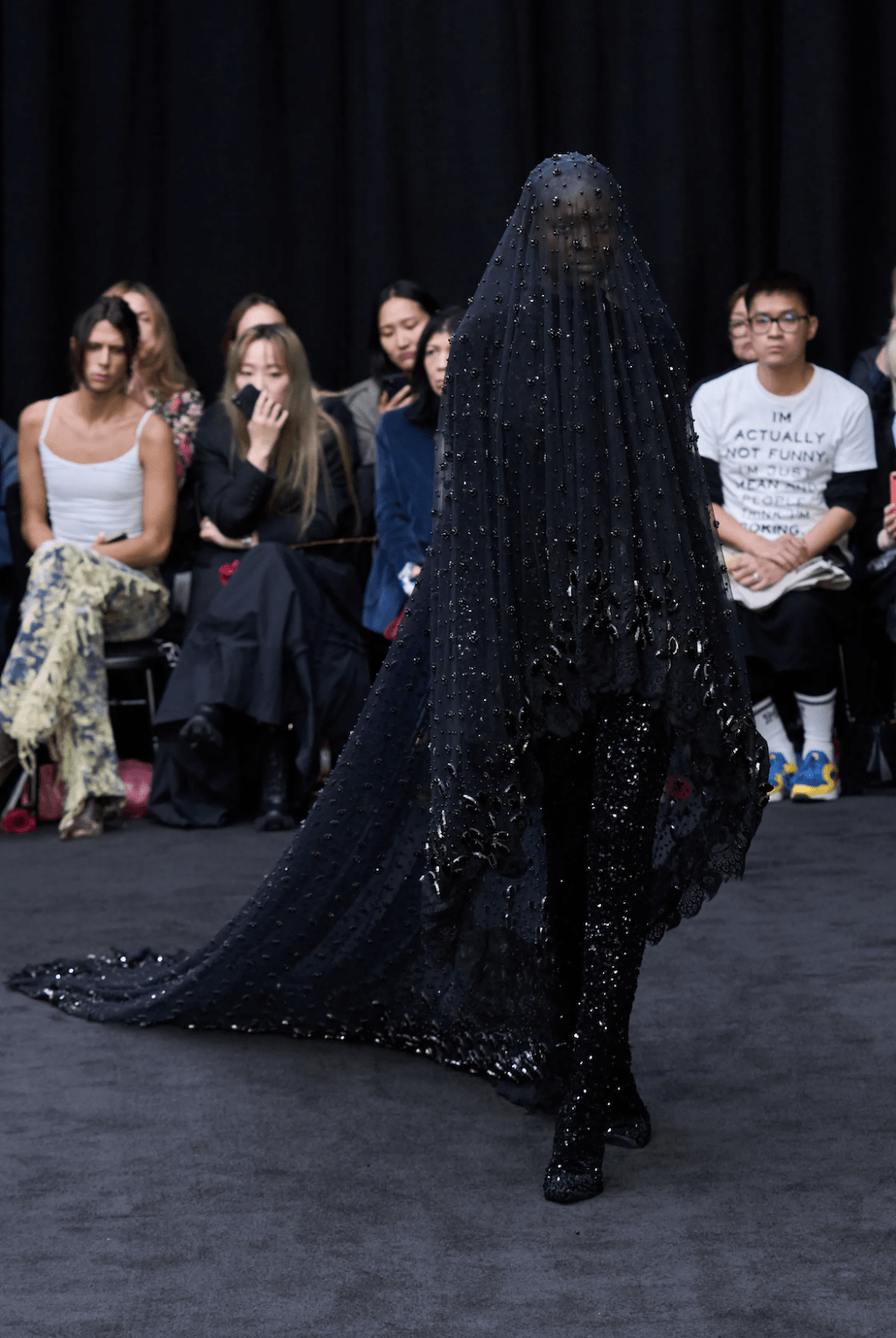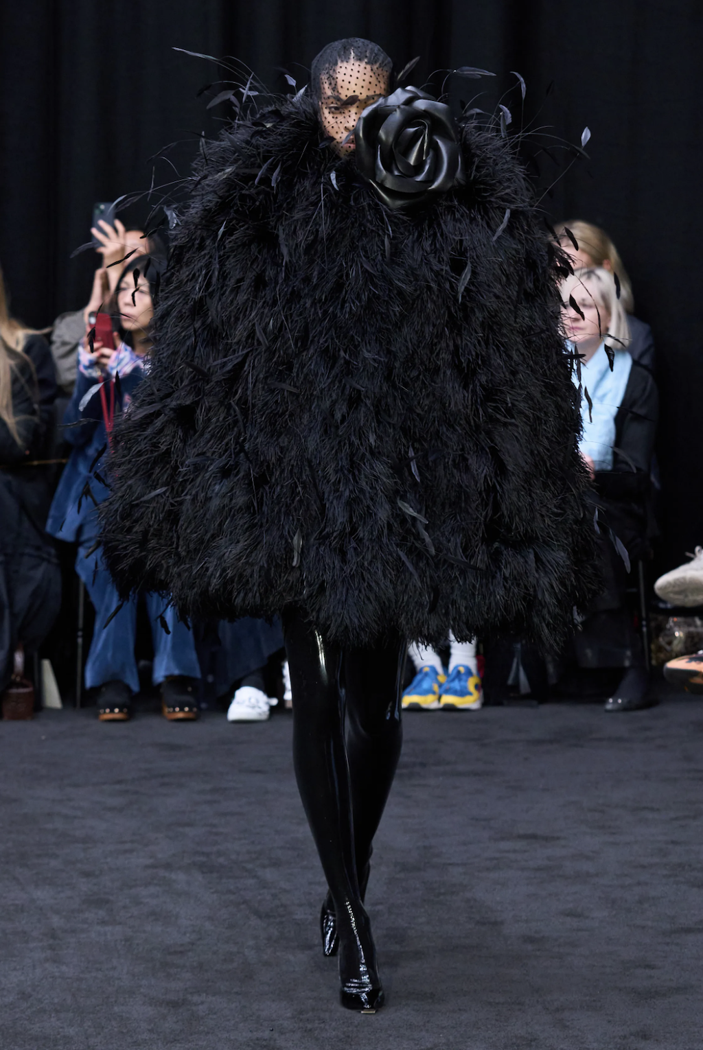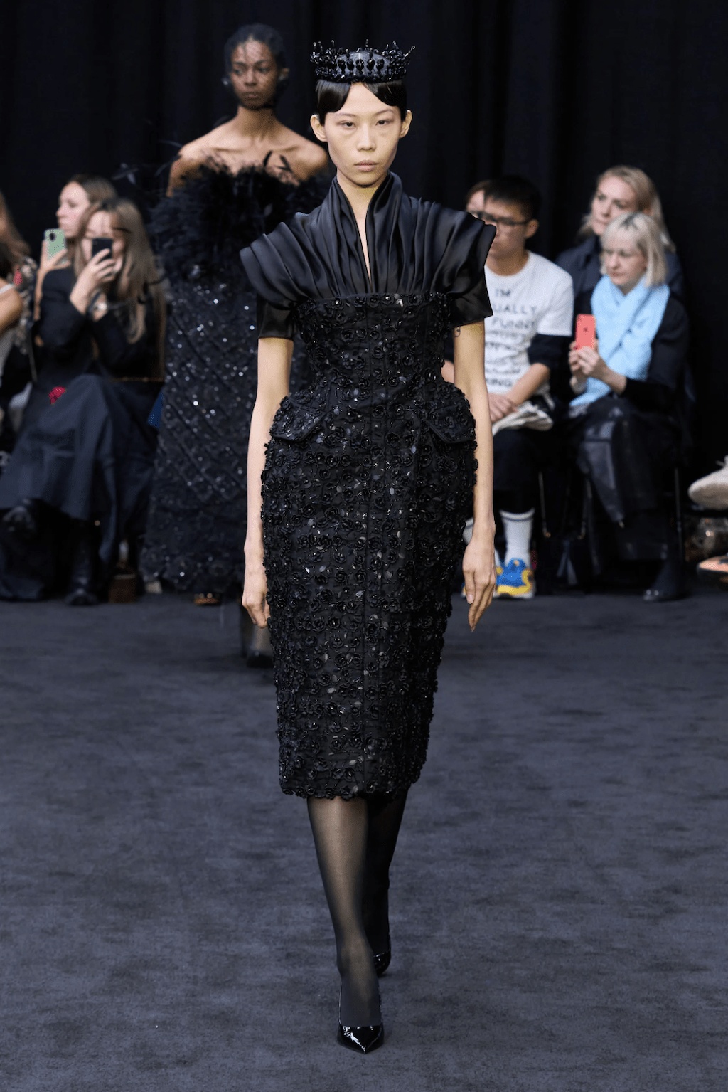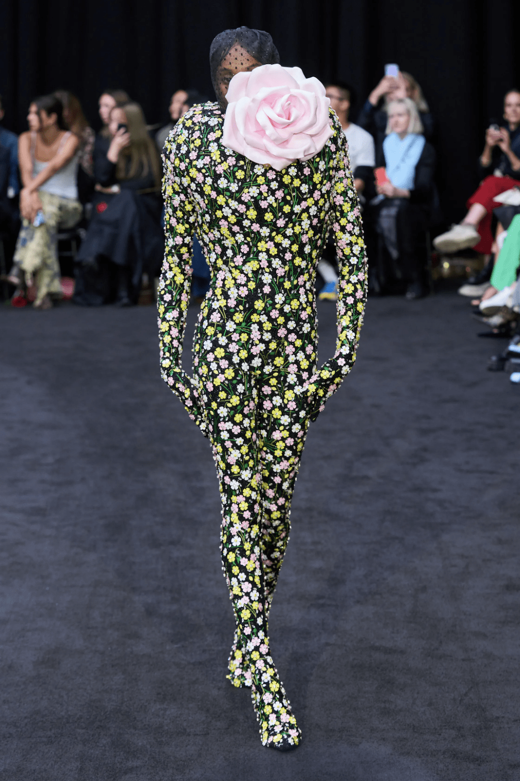 → London’s hottest fashion whiz kid totally dedicated his Spring/Summer 2023 collection to Her Majesty the Queen, Elizabeth II. or rather the attire for the mournful event of her burial. Saying that “she touched him among so many others with her grace and kindness”, the show opened with an entirely black series of regal gowns, paired with veils and crowns, as vintage footage of the Queen played on screens in the centre of the catwalk. Not to forget the Queen’s iconic surprise appearance in 2018 when she actually attended one of his shows. After the tribute to this great monarch of England, the show continued as typically dramatic as we know Richard Quinn for. With exaggerated silhouettes walking the runway, he designed part two of his collection for Spring/Summer 2023 to “embody an exquisite futurism”. But see for yourself and let yourself drive into the bold patterns in a world as Richard Quinn creates for us.