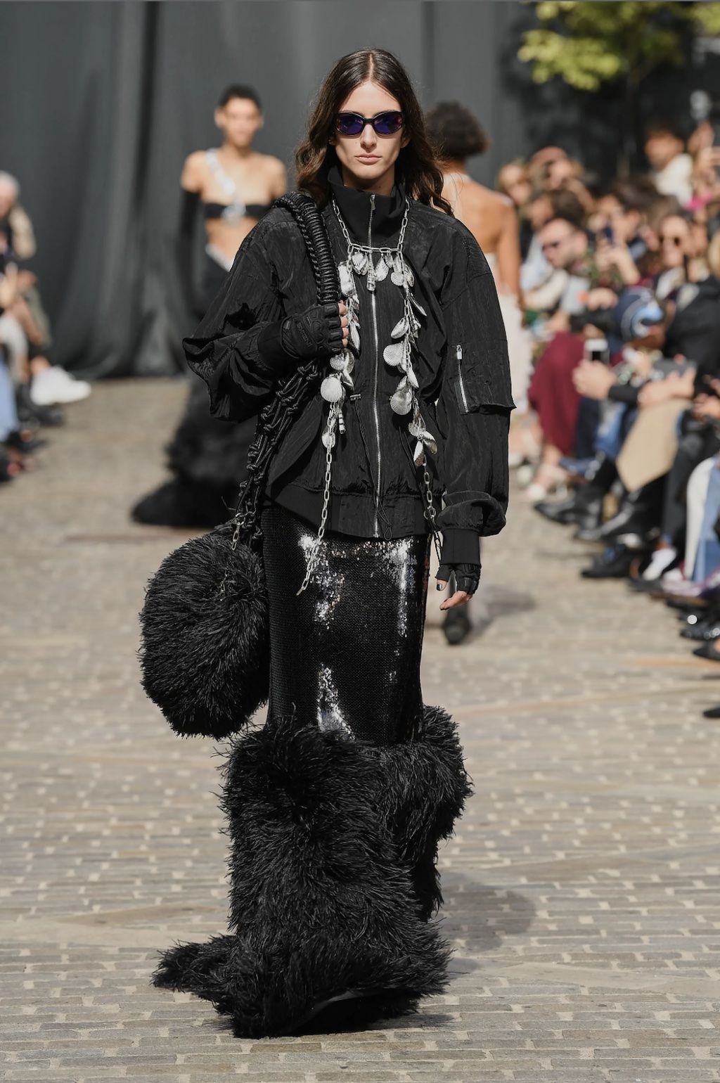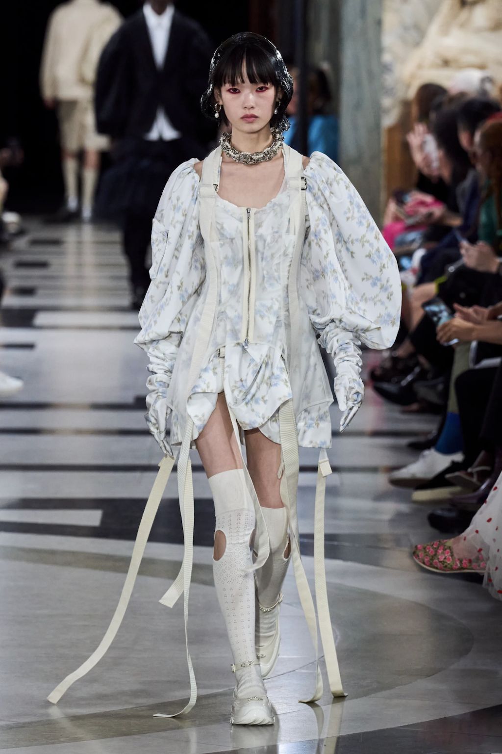 → Simone Rocha also dared to do the daring. Menswear it is. Right after her huge commercial sell-out success with H&M last year, she sent male models down the runway under the domed ceiling of the Old Bailey for the first time. Mixing frills with utility details across women’s and menswear, oversized bomber jackets, and petticoat frills worn as both skirts and veils were her central theme. The Irish fashion designer spent her time outdoors seeking inspiration. The resulting collection represented the healing of the earth, featuring floral motifs - chamomile, daisies, tulip coats - blended with Rocha's signature deconstructed designs and disrupted proportions. Simone Rocha described her SS23 show as “a reaction to distress” as well as “fragility, remorse, and anger”. Unusual trailing harness straps were used with ruched-up skirts and shirting and hung from oversized backpacks. Intricate sequin flowers and bow embroideries appeared on dresses. The verdict? A tour de force and the largest round of applause of the week.