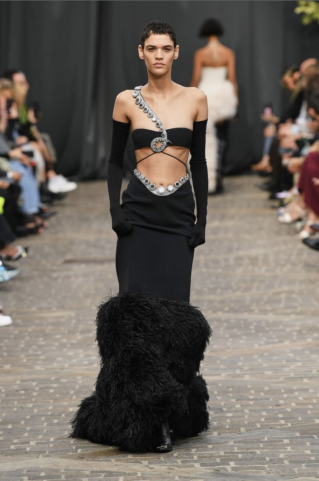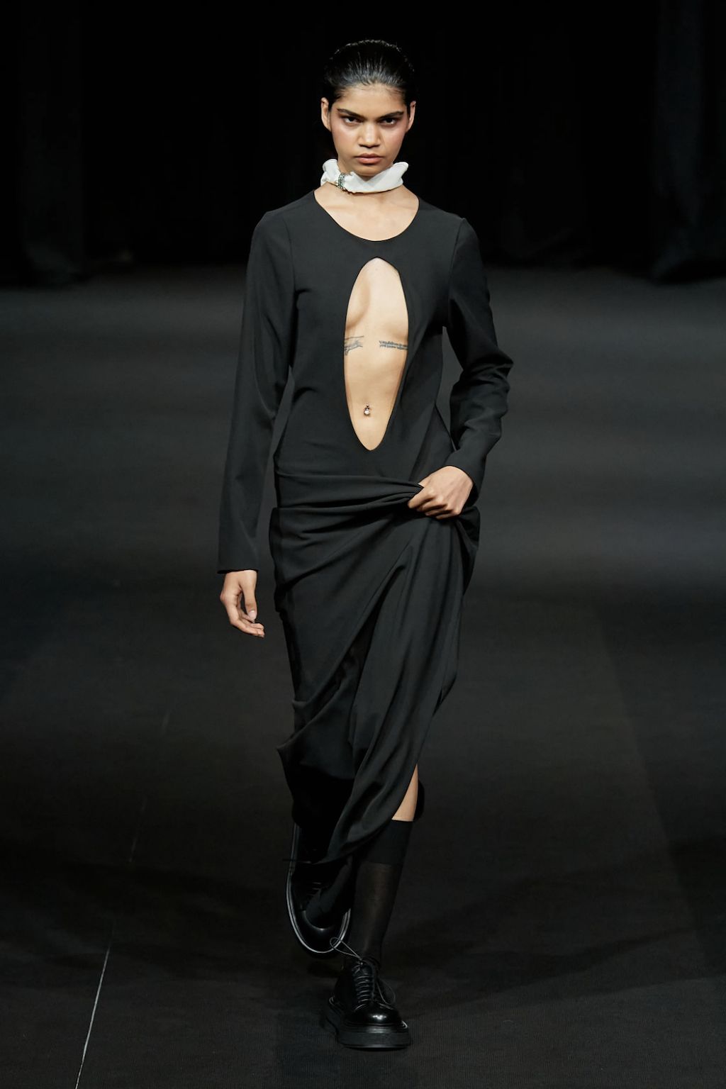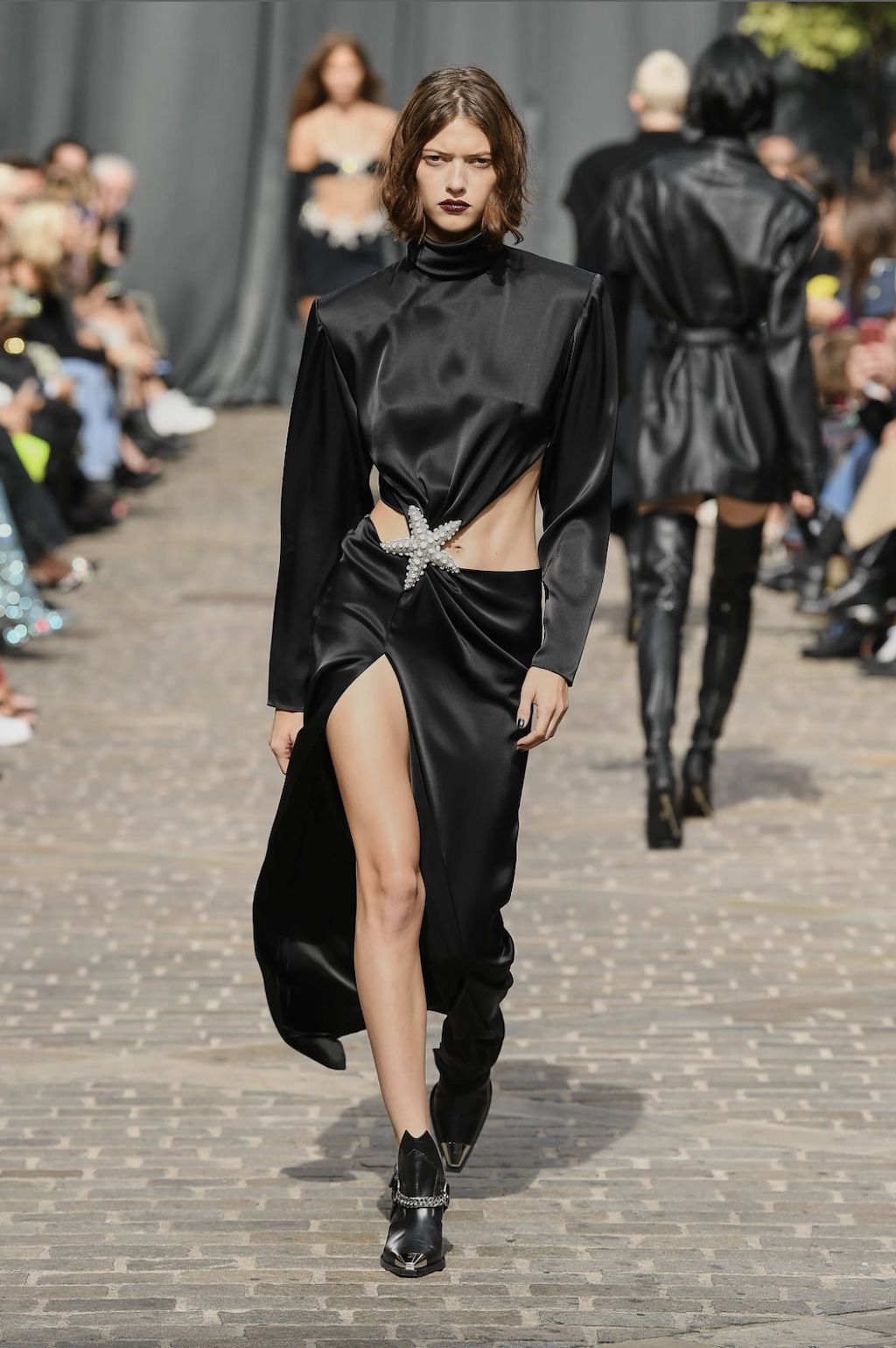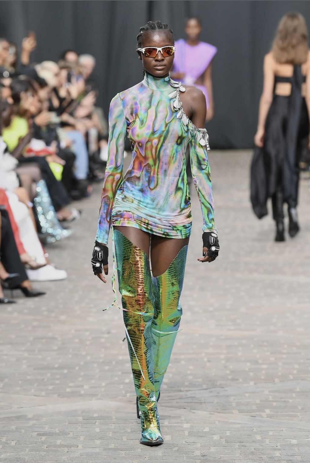 → For Spring/Summer 2023, star-favourite David Koma found his inspiration on the streets of London surrounding his Shoreditch studio, shortly after becoming a British citizen and still living each day with open eyes as if it were his first after the Georgian finally immigrated to the United Kingdom. It is the “everyday enchantment”, that gave him the drive to create a collection full of black cocktail dresses and cut-out designs inspired by the oily, iridescent colour formations of petrol on the pavement – and the more otherwordly landscape that lies deep under the sea far apart of river Themes, with its shimmering shells and starfish. And it was exactly there, where he was inspired by, where he staged the runway spectacle. Outside of his studio on the streets of the Theatre Courtyard Gallery, a location that just so happened to be where William Shakespeare put on his first play, Koma-Girls and Boys instead mixed up the neighbourhoods colour game. “This season, a conversation between accidental and environmental beauty informs a collection founded in the clash and harmony between the natural and the cultural”, explained the show notes.