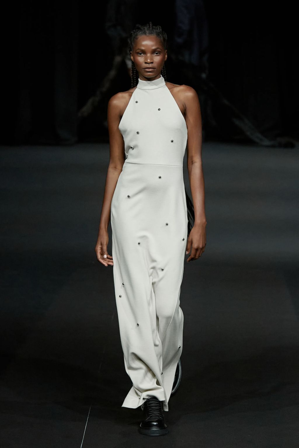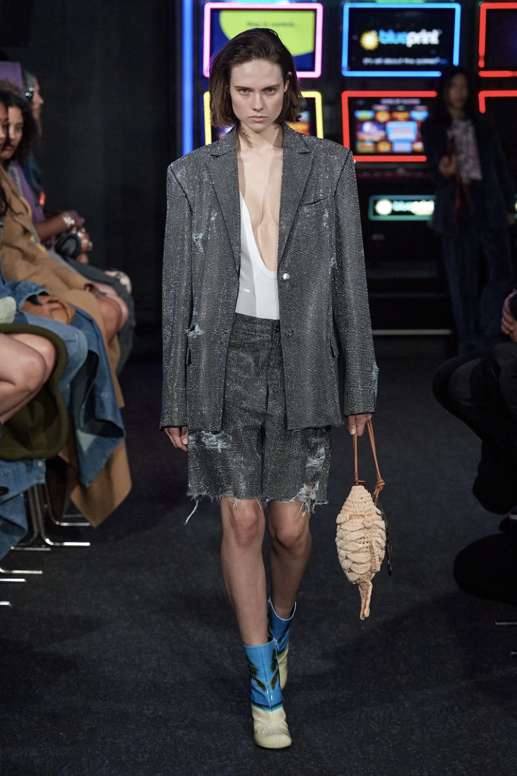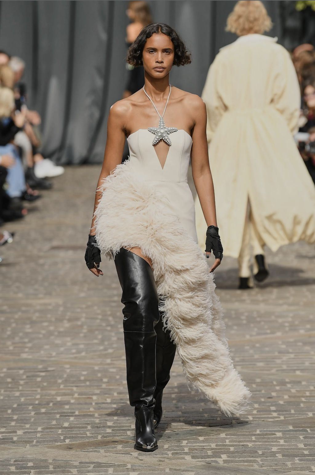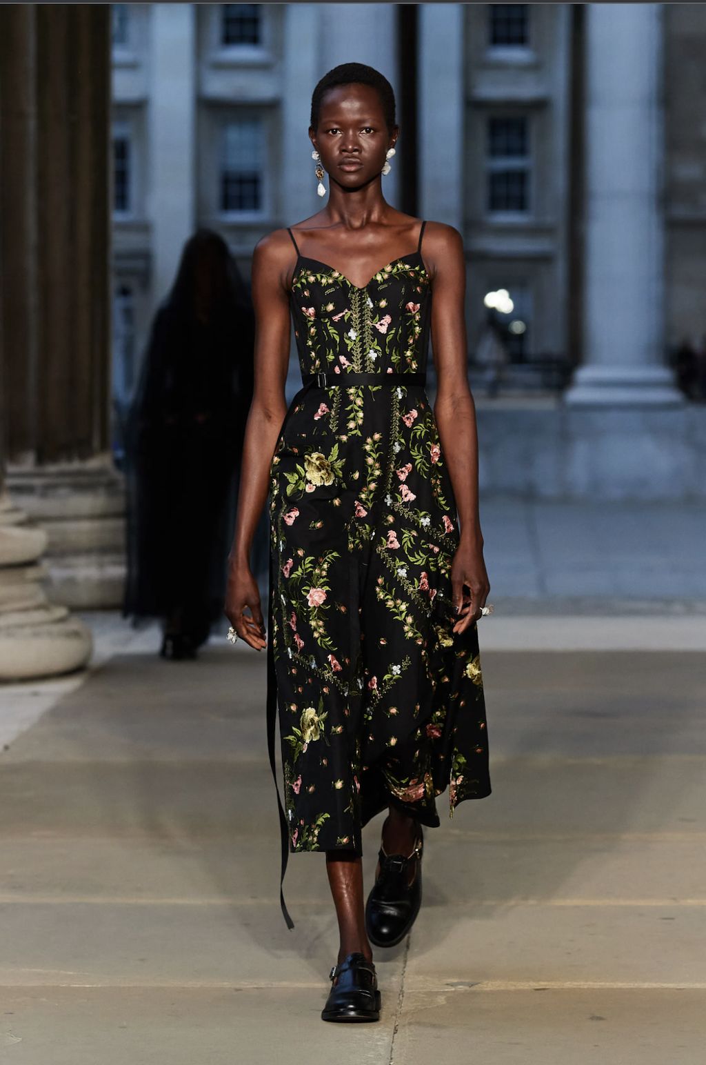 → For Spring/Summer 2023, star-favourite David Koma found his inspiration on the streets of London surrounding his Shoreditch studio, shortly after becoming a British citizen and still living each day with open eyes as if it were his first after the Georgian finally immigrated to the United Kingdom. It is the “everyday enchantment”, that gave him the drive to create a collection full of black cocktail dresses and cut-out designs inspired by the oily, iridescent colour formations of petrol on the pavement – and the more otherwordly landscape that lies deep under the sea far apart of river Themes, with its shimmering shells and starfish. And it was exactly there, where he was inspired by, where he staged the runway spectacle. Outside of his studio on the streets of the Theatre Courtyard Gallery, a location that just so happened to be where William Shakespeare put on his first play, Koma-Girls and Boys instead mixed up the neighbourhoods colour game. “This season, a conversation between accidental and environmental beauty informs a collection founded in the clash and harmony between the natural and the cultural”, explained the show notes.