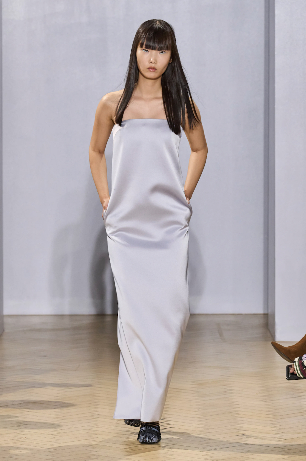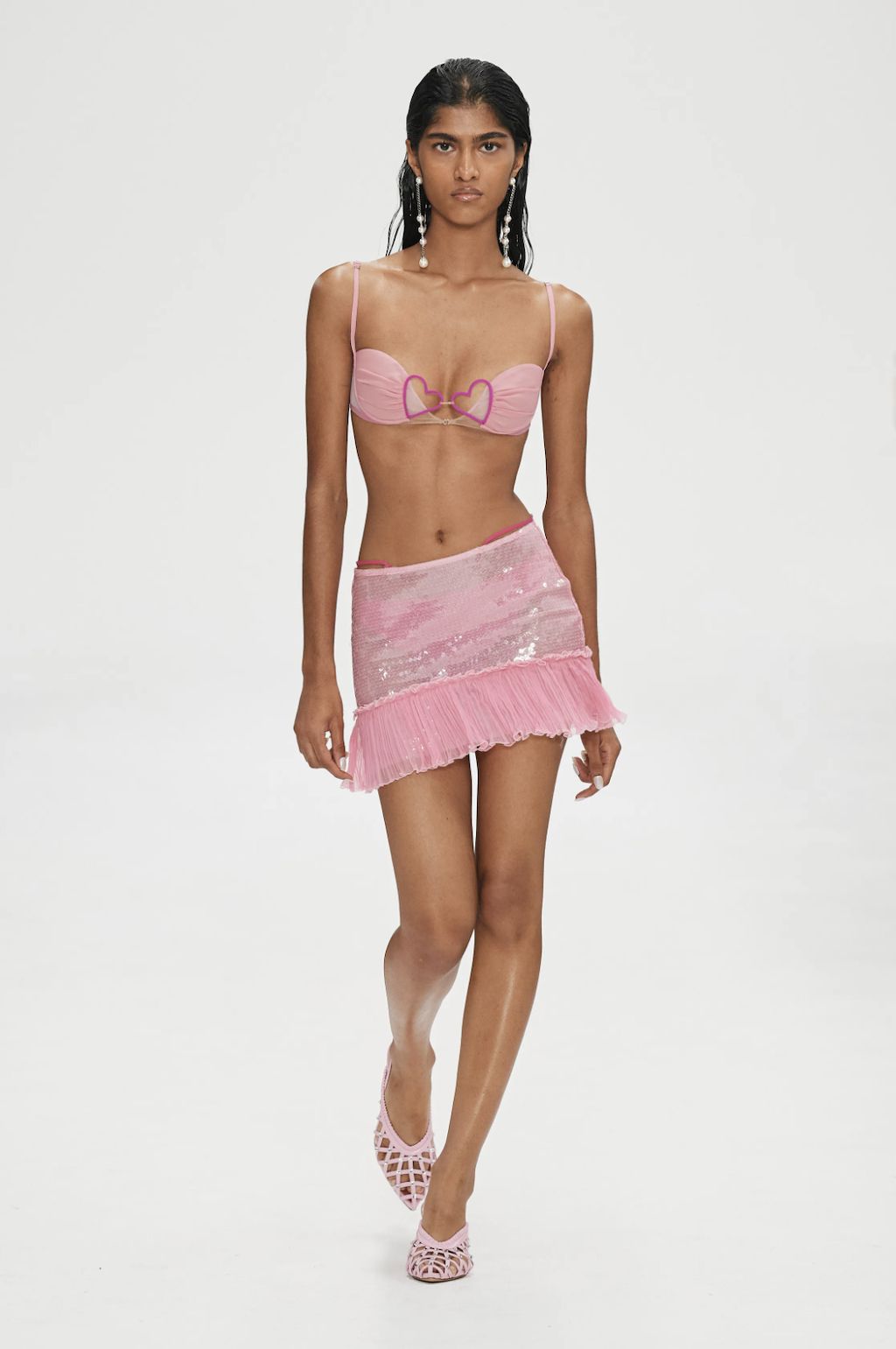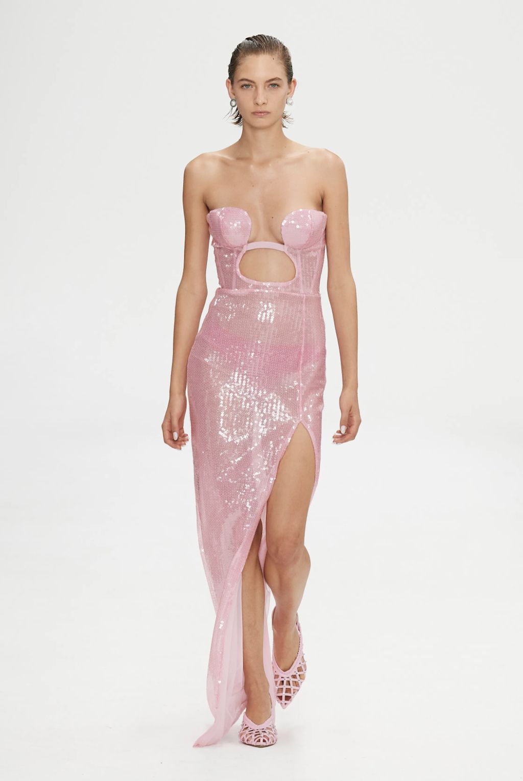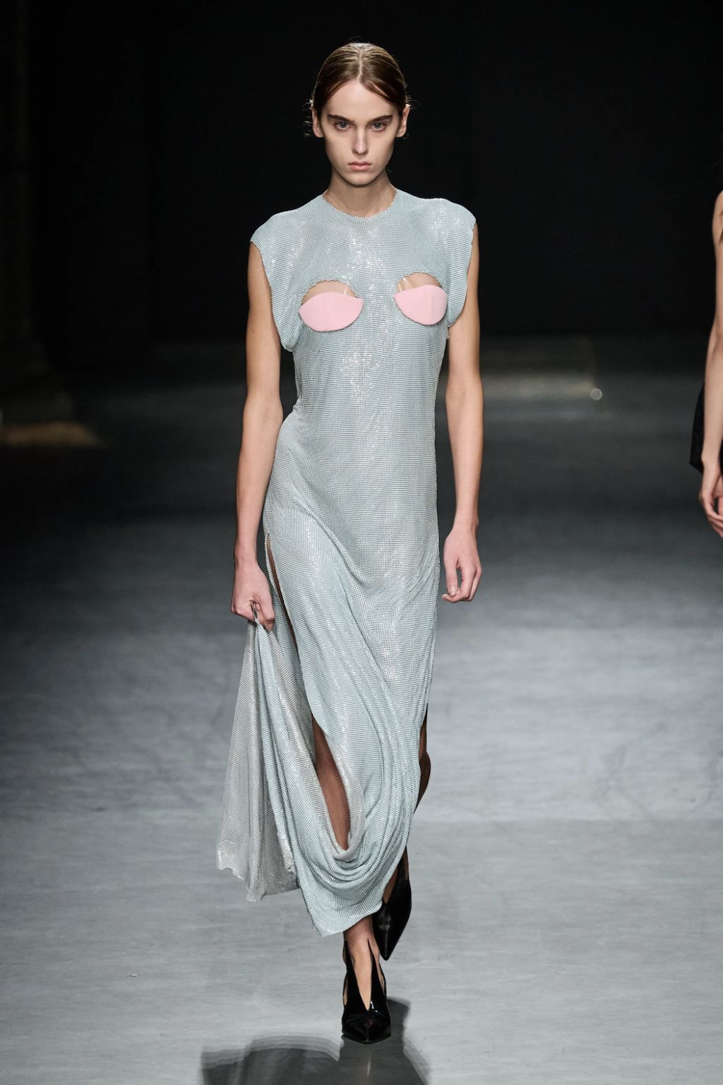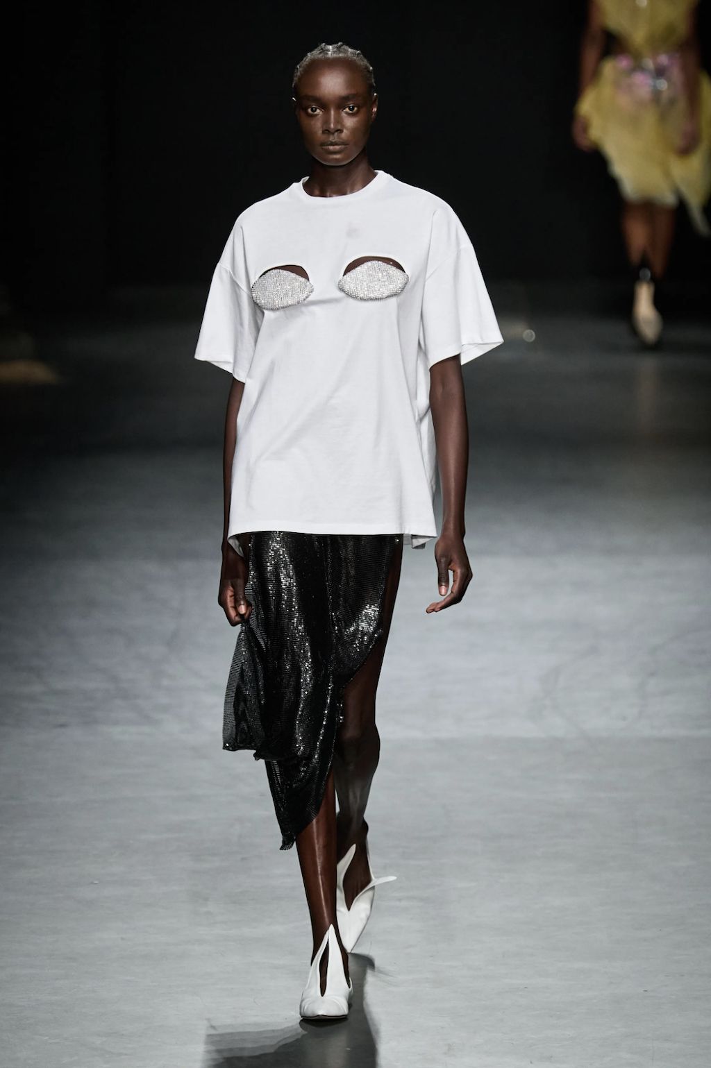 → It’s always tricky when a breakout designer has a “signature look” because how can they go forward while still making what people want? For this season, however, she reinterpreted her own signature lingerie-like pieces and played with fluidity and structure. Nensi Dojaka has figured that out by boosting her famous twist-and-cup bra tops with paper-thin evening slips and lurex metallic bodysuits, along with a pair of truly excellent wide-legged jeans. It was a true ode to the designer’s “eternal inspiration”, the flower, as sequins gently embellished dewy evening gowns and her signature slip dresses, in silver, lilac and pink fabrics shimmer down the runway. Subtly touching on eroticism, the collection married lurex and lace sculpted into bra cups, while leopard print and denim nodded to the 1990s, but, if we’re being totally honest, having Emily Ratajkowski close the show in a merlot cling-wrap corset gown was a pop culture freeze frame on its own.