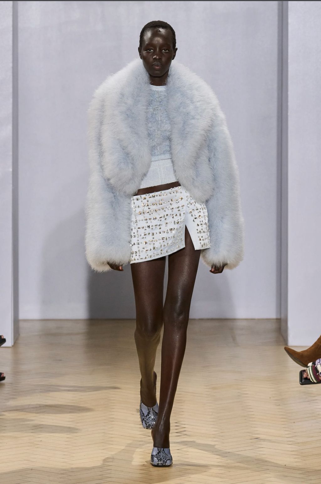 → The day before the world prepared to say goodbye to Her Majesty the Queen, 16Arlington showcased a collection that was fittingly titled ‘Forget Me Not’, inspired by “the wildflower with petals of dusty pink and faded lilac-blue; a symbol of true and eternal love, devotion and remembrance”. Even though Elizabeth II.’s demise came at such short notice, this collection is actually designed in tribute to the brand’s co-founder Federica ‘Kikka’ Cavenati, who passed away suddenly in November 2021, at the age of 28. Marco Capaldo, the current label’s lead, made the 16Arlington universe so tangible, as they both always dreamed it would be. Only now, one of them is watching from the other side of their shared universe. Whereas the previous collection featured beading and crystals applied in light splashes to recall teardrops, here Marco Capaldo looked to the forget-me-not flower as his point of departure, deliberately working with more minimalist silhouettes cut from icy blue and lilac raw-edge silk satins in order to balance out his signature Swarovski crystals and faux fur, marabou-trimmed party dresses.