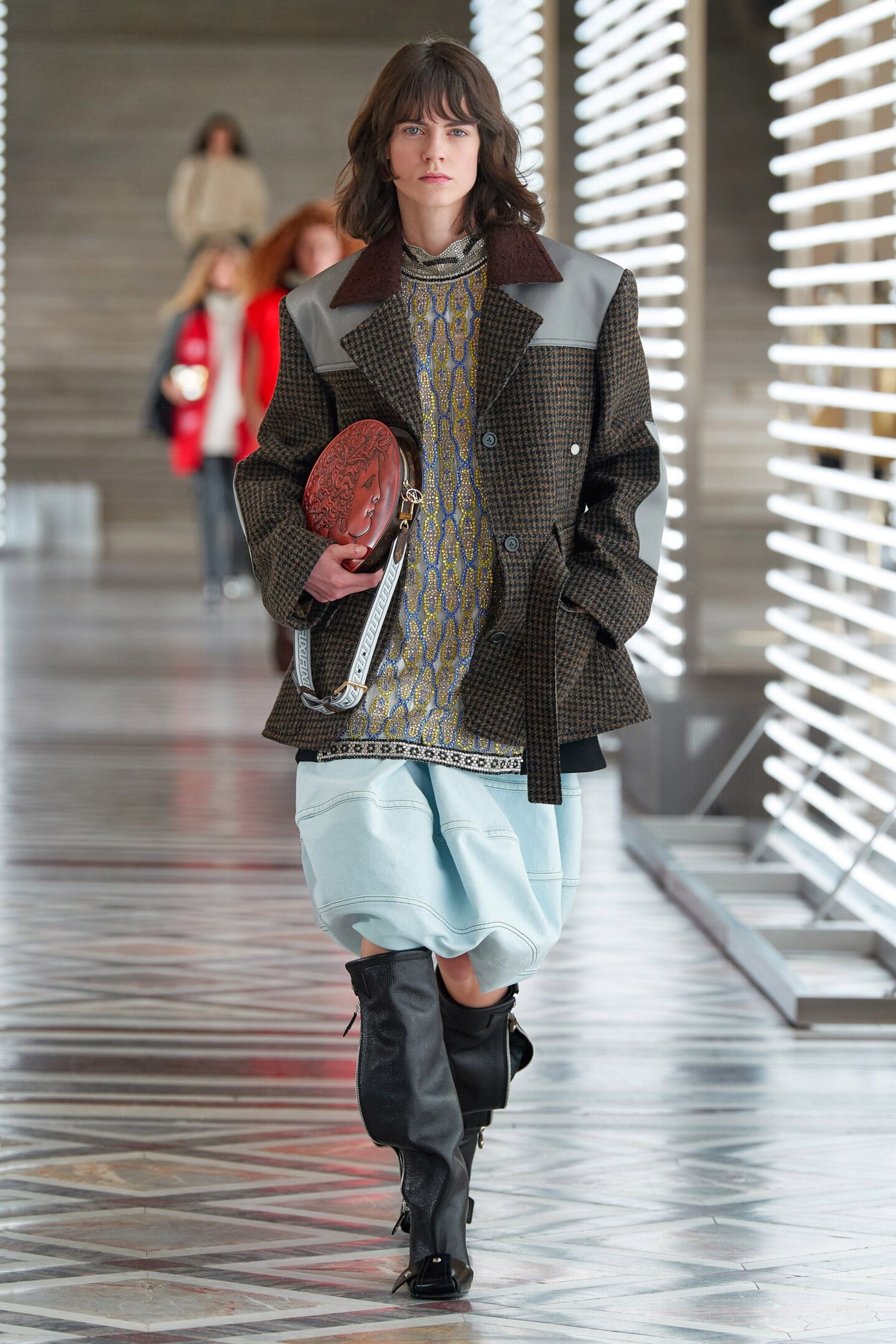 The looks were mostly completed with wedge-heel boots and movement was the focus of the collection: blouson jackets, cocooning capes and voluminous skirts presented in different fabrics.