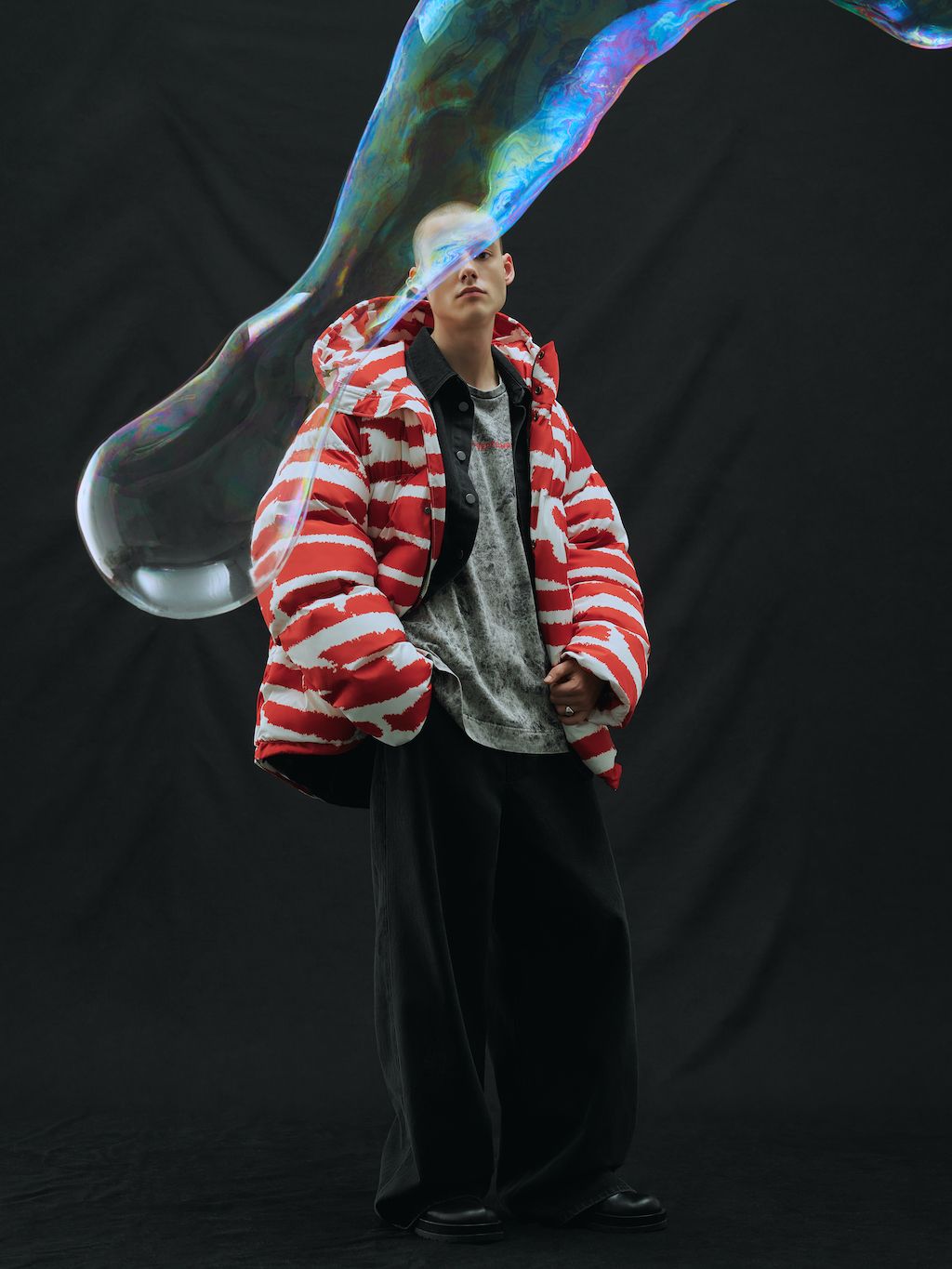 Having processed these feelings, Red September asked themselves the type of clothes needed in the bubble-like situations we still live in today, bringing a really special take for their Fall/Winter 2023/24 collection. Colors are toned down favoring voluminosity for practical purposes, with hoodies and puffer jackets that make you want to wrap yourself up and wear multi-layered outfits to reflect that isolating feeling.